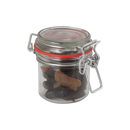 Glazen weckpotje 125 ml gevuld met snoep categorie Speciaal, voorzien van full colour label op deksel