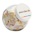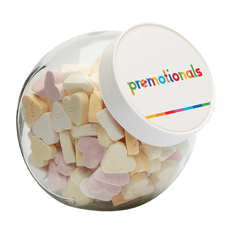 Glazen snoeppot 870 ml met wit kunststof deksel, gevuld met snoep categorie basis. Full colour label op dekel en ideaal voor snoeppotten bedrukken.