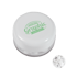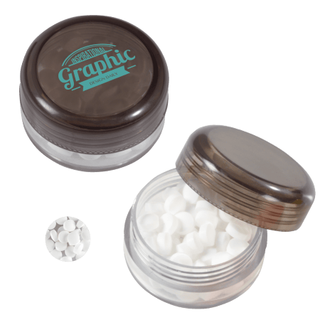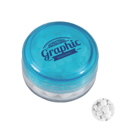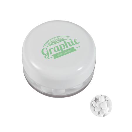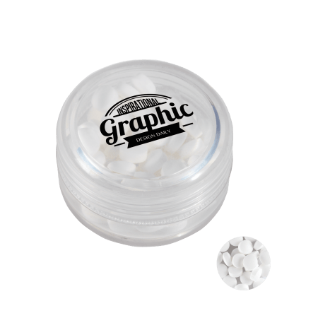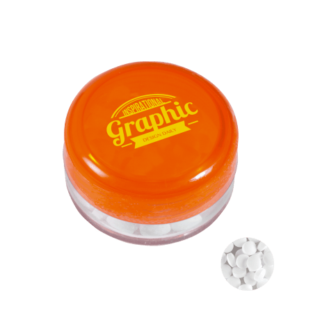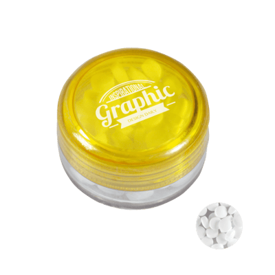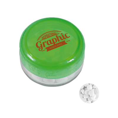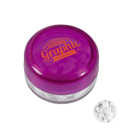 Kunststof rond potje ø 45x25 mm met gekleurd deksel en ca.12 gr. extra sterke `triangle` mintjes TAMPONDRUK
