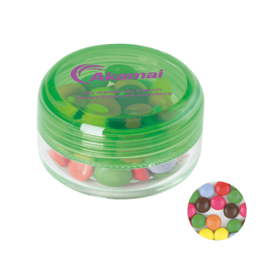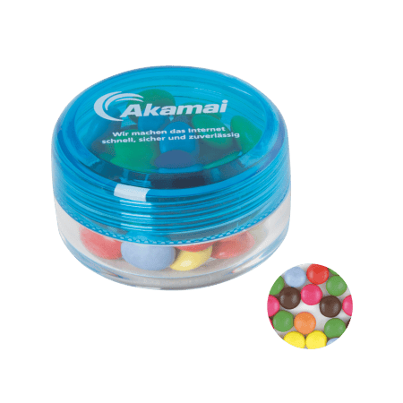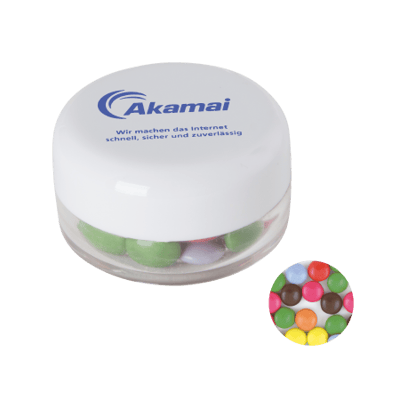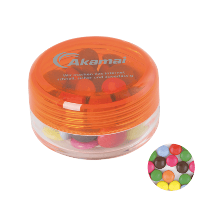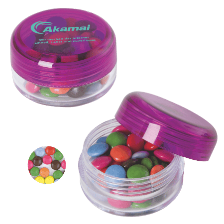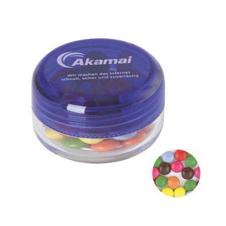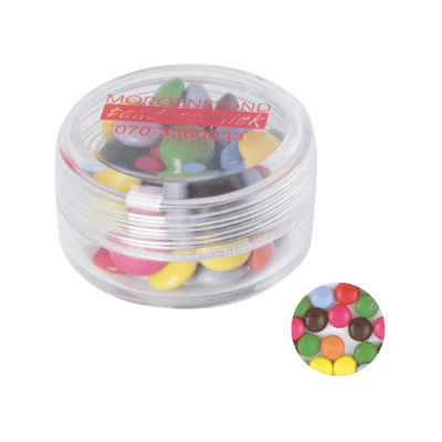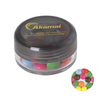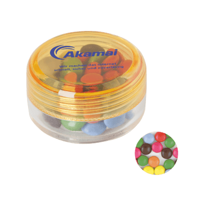 Kunststof rond potje ø 45x25 mm met gekleurd deksel en ca. 12 gr. chococarletties, TAMPONDRUK