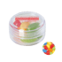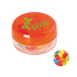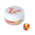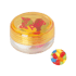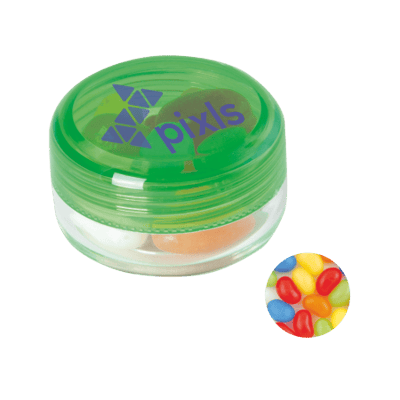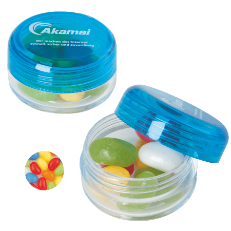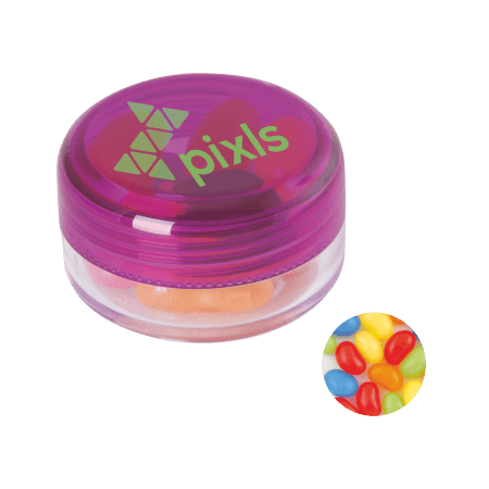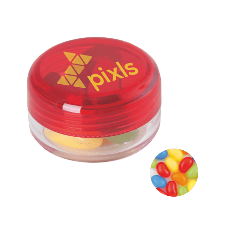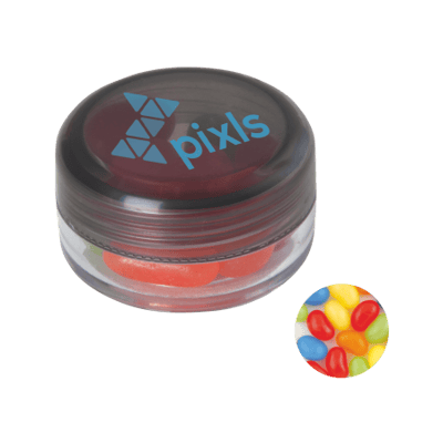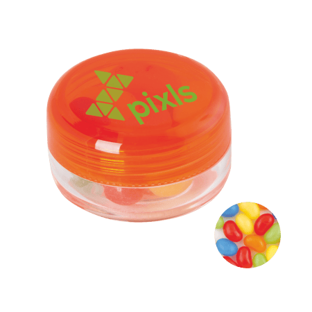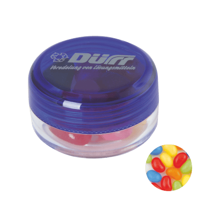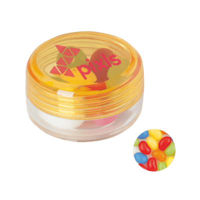 Kunststof rond potje ø 45x25 mm met gekleurd deksel en ca. 12 gr. jelly beans, TAMPONDRUK. Perfect voor snoepgoed bedrukken.