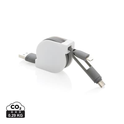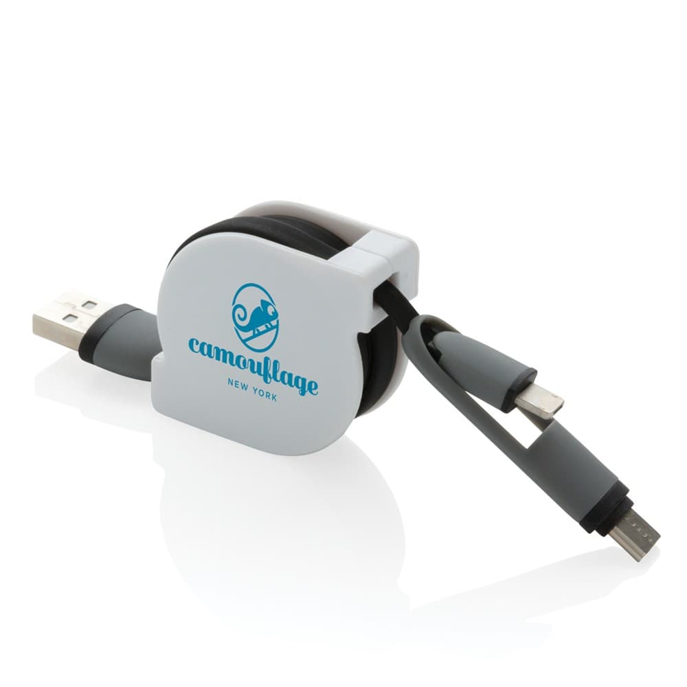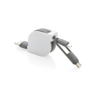 Compacte en oprolbare 3-in-1 oplaadkabel met type C en dubbelzijdige connector voor iOS- en Android-apparaten die micro-USB vereisen. Dankzij het rolmechanisme kan de 100 cm lange platte kabel gemakkelijk worden meegenomen zonder dat deze in de knoop raakt. ABS behuizing met TPU-kabel. Ook geschikt voor synchroniseren.