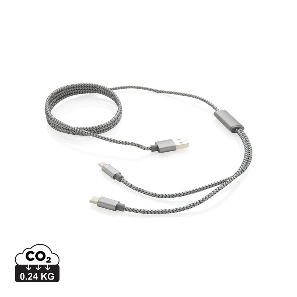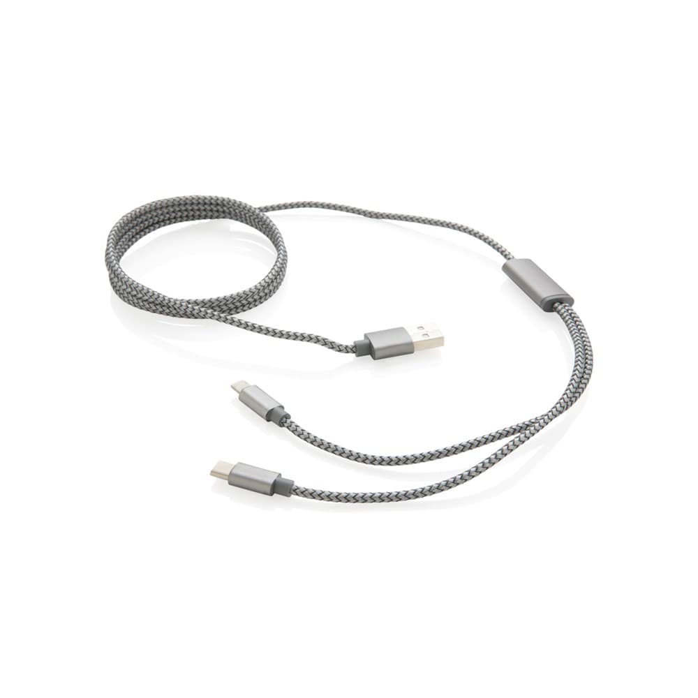 Luxe gevlochten 3-in-1 kabel met type C en dubbelzijdige connector voor iOS- en Android-apparaten die micro-USB nodig hebben. Gevlochten nylon materiaal met connectors gemaakt van duurzaam aluminium. Geschikt voor opladen. Lengte 120 cm.