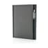 A5 omslag met magnetische sluiting en pennenlus. Binnen in 3 vakjes voor business cards en 1 groot vak. A5 notitieboek met 128 pagina’s van 80 g/m2.