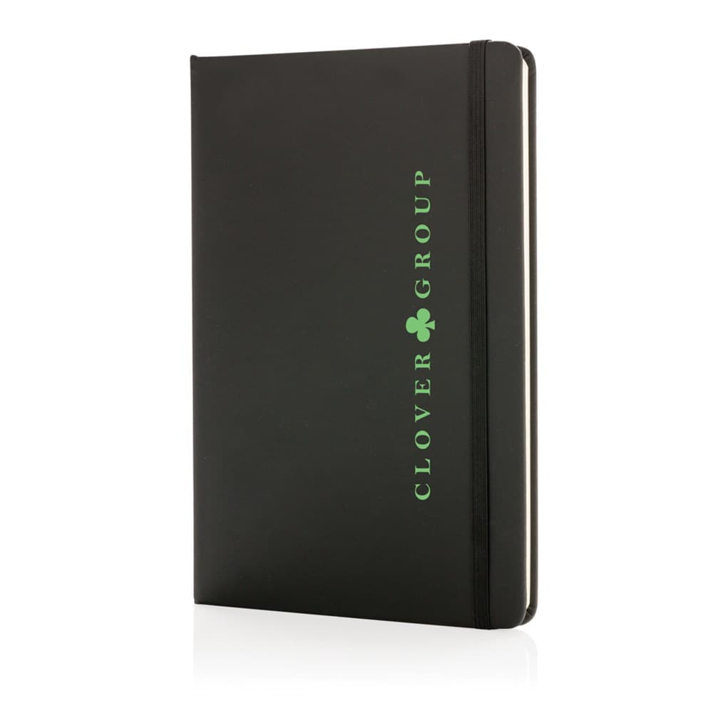 A5 hardcover gelinieerd PU notitieboek met elastieken band sluiting en zwarte bladwijzer. 144 pagina’s van 70g/m2.