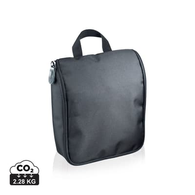 1680D polyester toilettas met waterafstotende voering, legio opbergvakken, inclusief metalen bevestigingshaak.