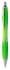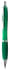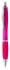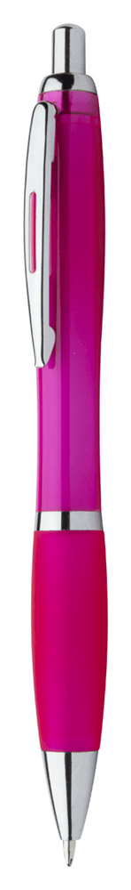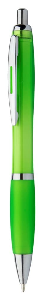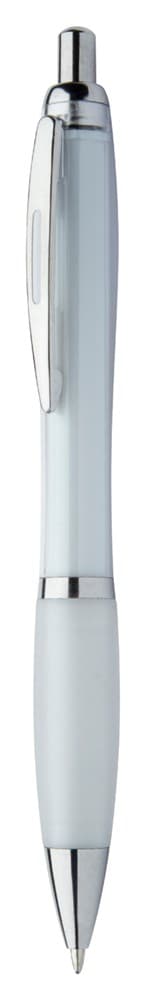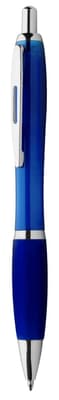 Plastic balpen met transparante basis, bijpassend gekleurde grip en glanzende chromen onderdelen. Blauw schrijvend.