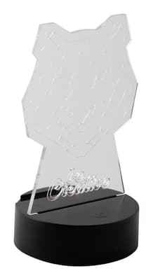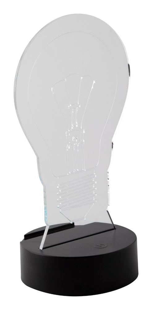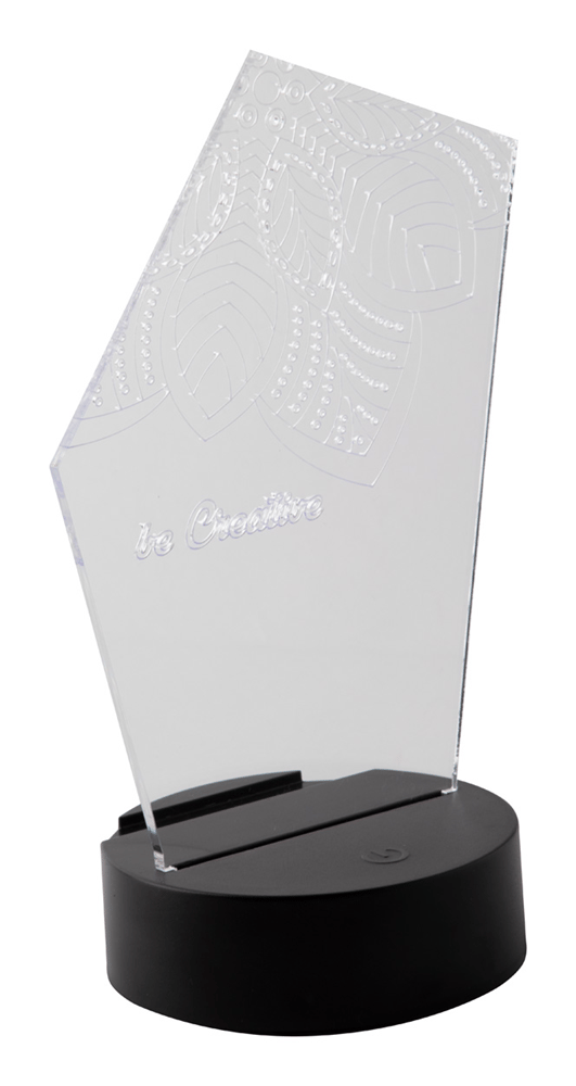 Custom made acryl trofee met multi colour LED-light base. In unieke vorm en gravure. Met 3 AA-batterijen. Prijs is inclusief gravure. MOQ: 25 stks.