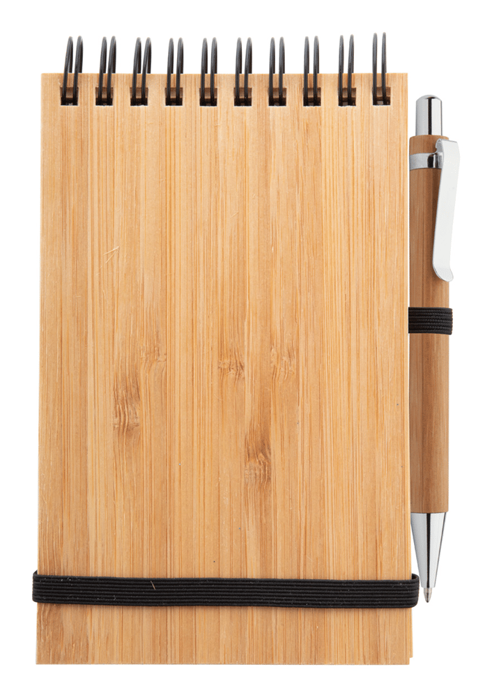 Notitieboek met bamboo cover, 70 gelinieerde bladzijdes en bamboo balpen met blauwe vulling.