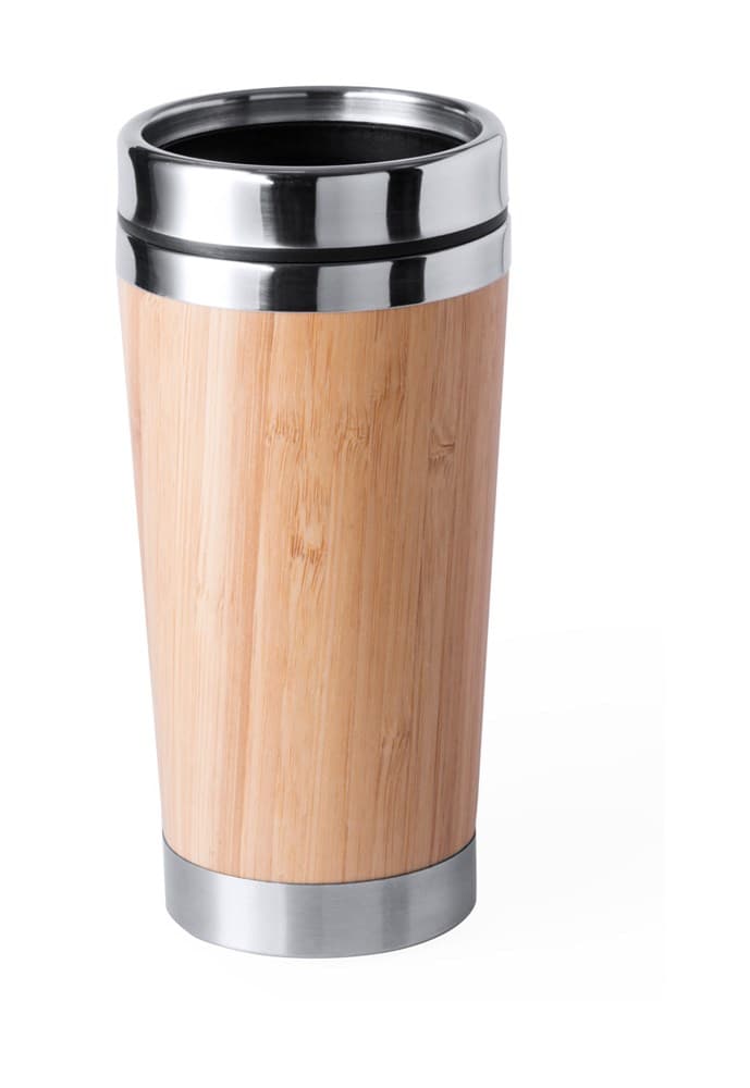 Met bamboe beklede dubbelwandige roestvrijstalen thermomok met drinkdeksel, 450 ml.