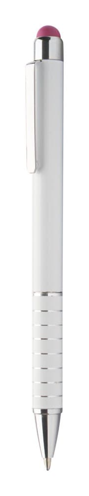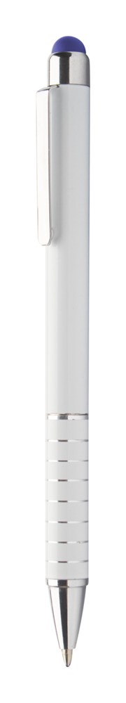 Aluminium balpen met touchscreen tip, witte huls en gekleurde touchscreen. Blauw schrijvend.