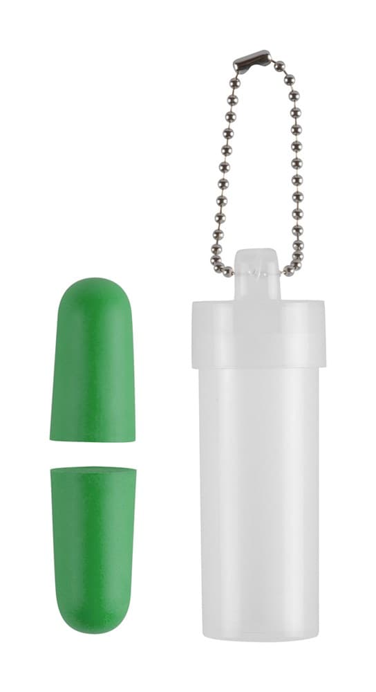 Gekleurde EVA oordopjes in transparant plastic verpakking met metalen ketting.