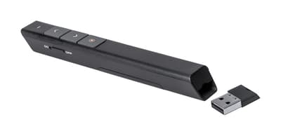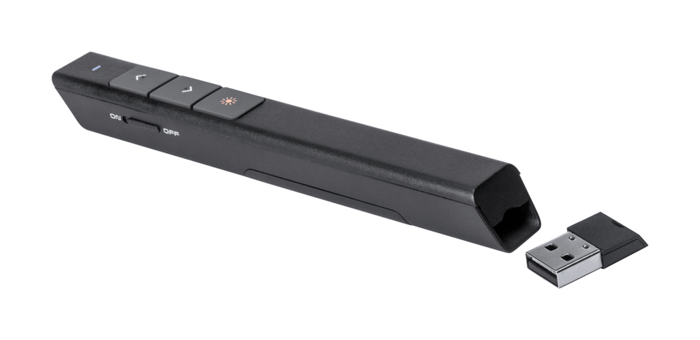 Plastic laser pointer met LED lamp en presentatiefunctie. In papieren geschenkverpakking. Met 1 AAA Batterij.