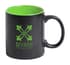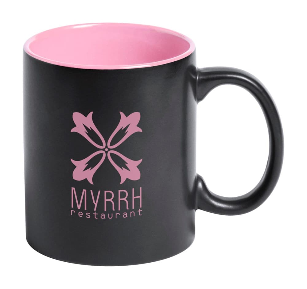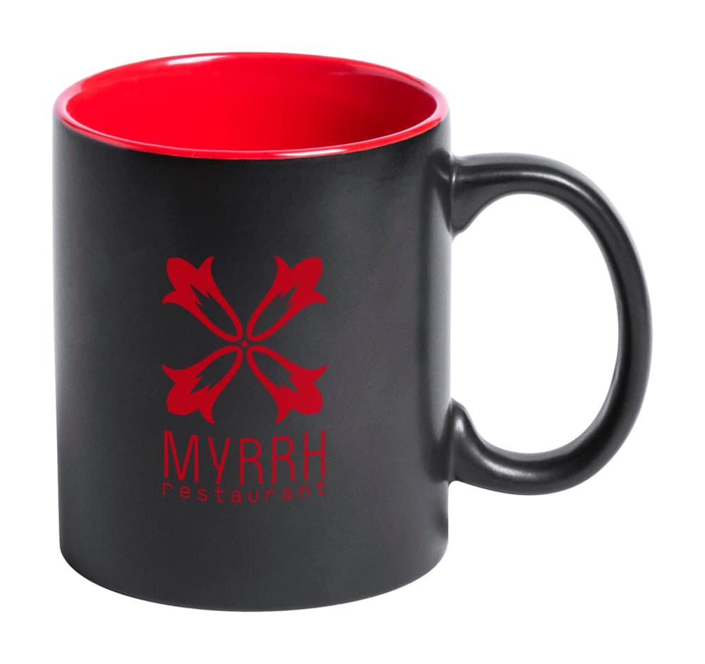 Zwarte keramische mok met gekleurde binnenkant. Met speciale coating geschikt voor gravure. Het gegraveerde logo wordt dezelfde kleur als de binnenkant van de mok. Geleverd in geschenkverpakking. Inhoud: 350 ml.
