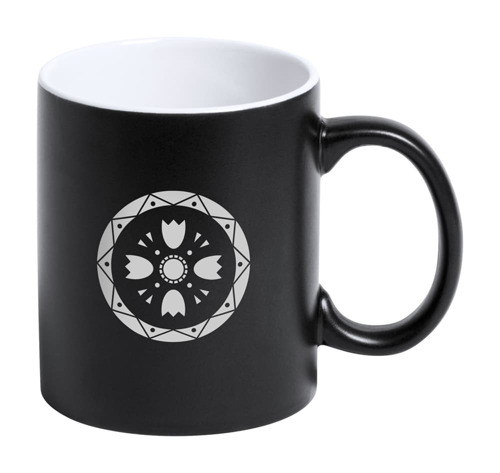 Gekleurde keramische mok met witte binnenkant. Met speciale coating geschikt voor gravure. Het gegraveerde logo wordt dezelfde kleur als de binnenkant van de mok. Geleverd in geschenkverpakking. Inhoud: 350 ml.