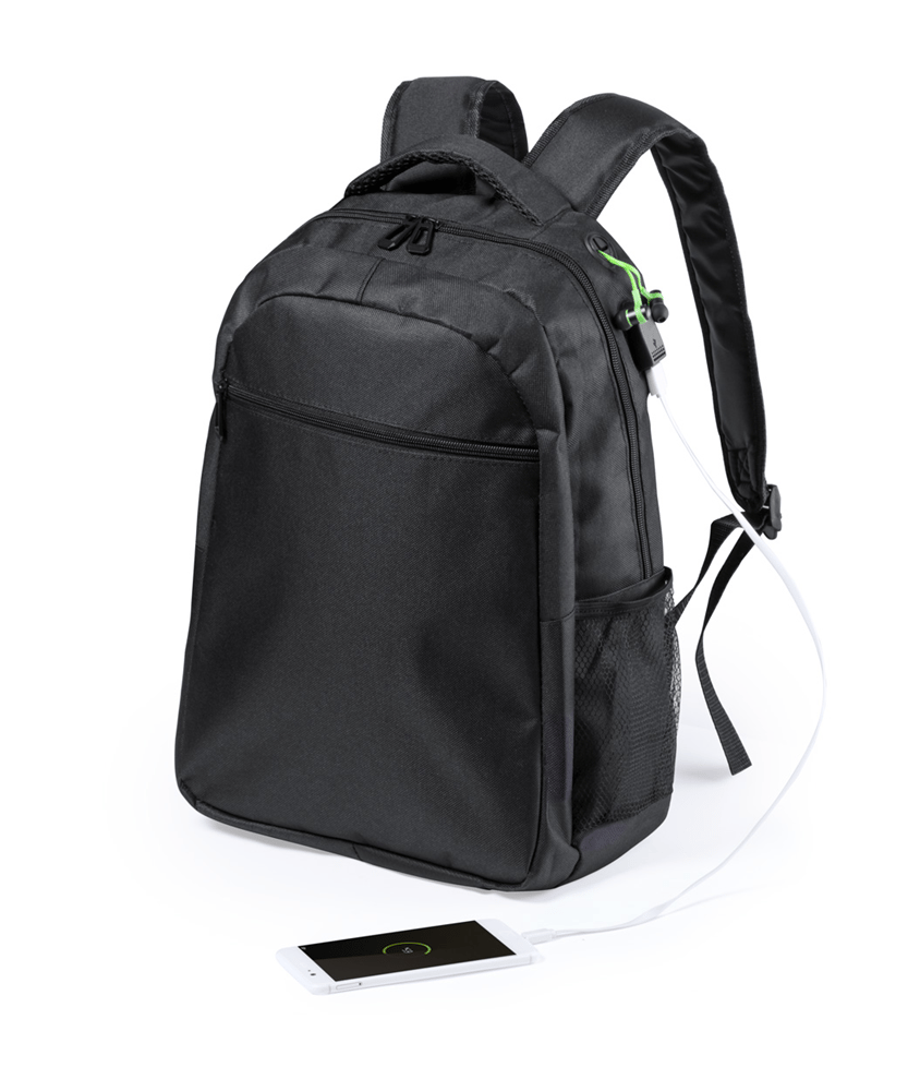 Waterdichte rugzak met compartimenten met rits, gewatteerd laptop- (15") en tabletvak (10"), gewatteerde rug en schouderriem. Met oortelefoonaansluiting en ingebouwde USB-aansluiting voor power banks. 600D polyester.