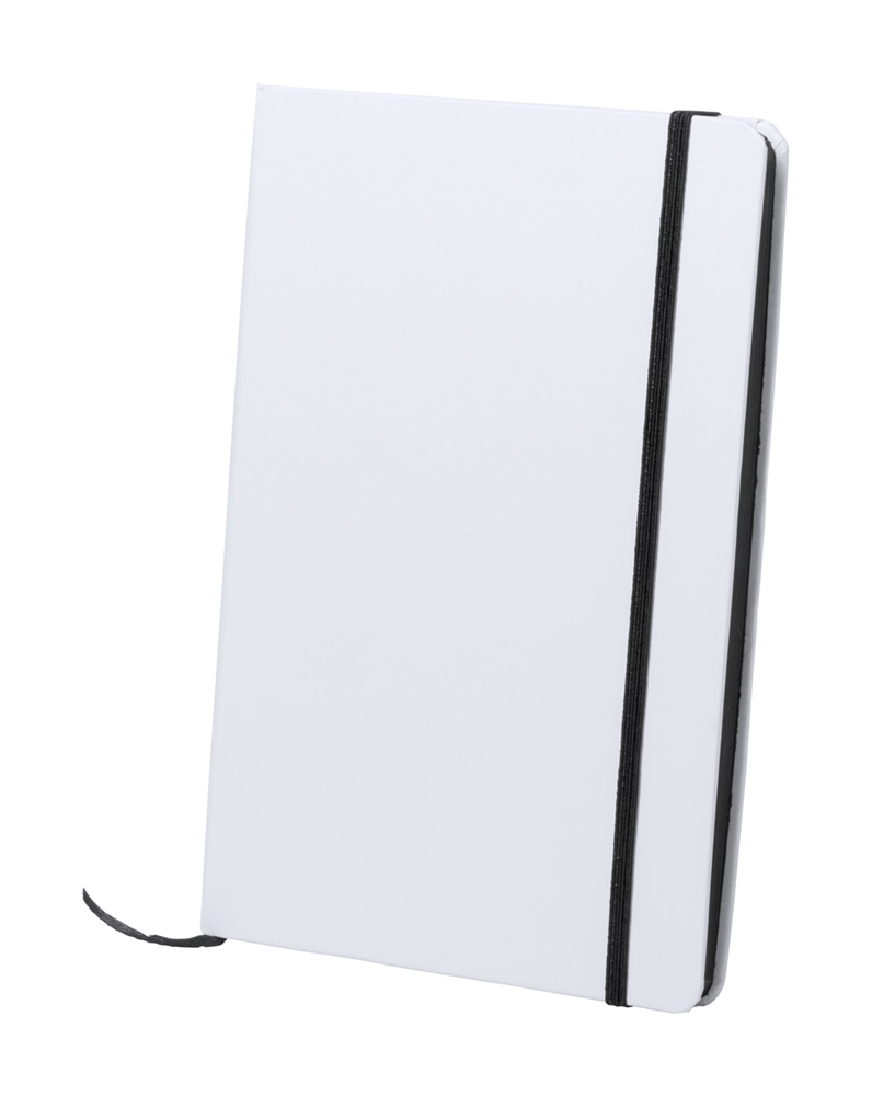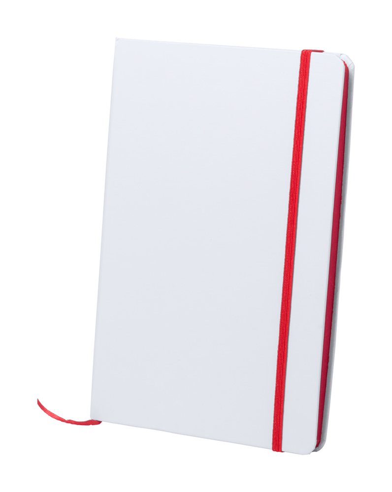 Papieren notitieboek met 100 blanco pagina's en gekleurde rubberen strap en bijpassend gekleurde zijkant. A5.