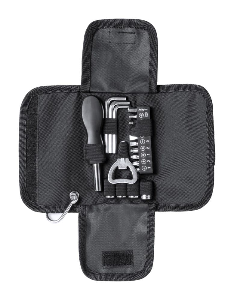 19-delige gereedschapsset in polyester hoes met karabijnhaak.