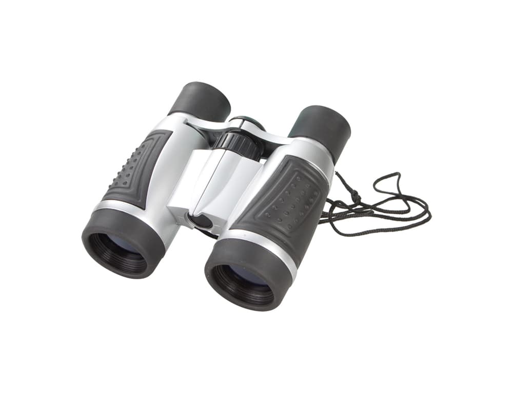 Plastic verrekijker met schoonmaakdoekje in nylon tasje. Vergoot vier keer.