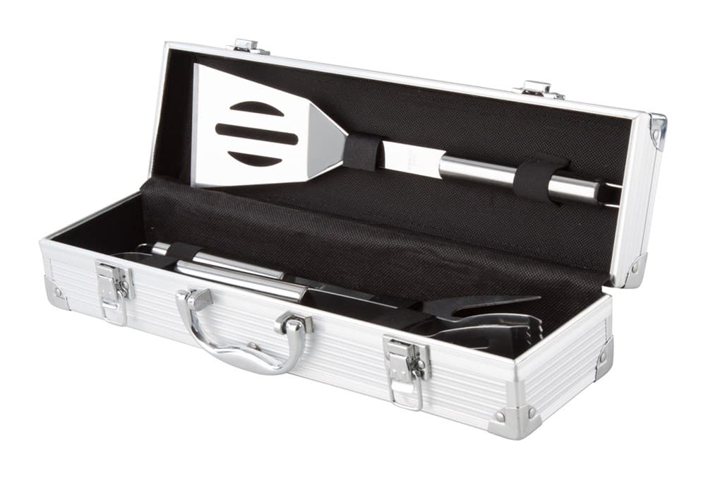 Drie delige RVS BBQ set. In Aluminium doos.