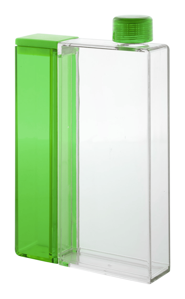 Rechthoekinge doorzichtige plastic waterfles met afneembaar bakje. Inhoud: 320 ml/ 125 ml. Niet geschikt voor koolzuurhoudende dranken.