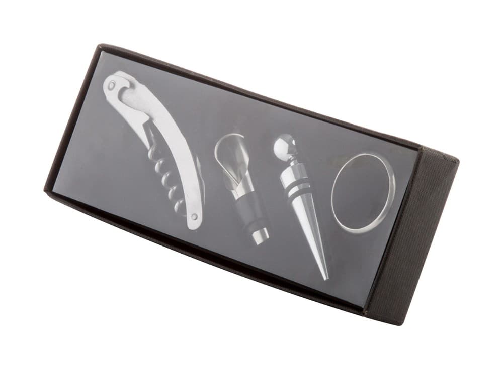 Wijn set met vier wijnaccessoires, in zwarte geschenkverpakking.