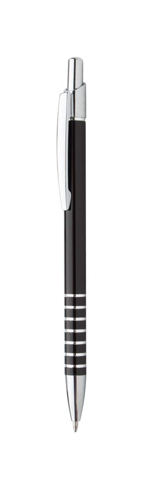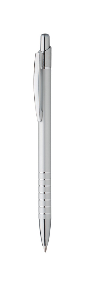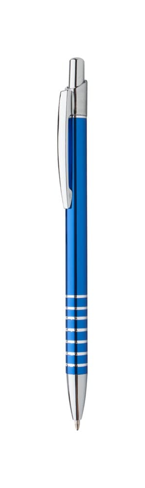 Aluminium balpen met ringen met metalen clip met chromen punt. Blauw schrijvend.