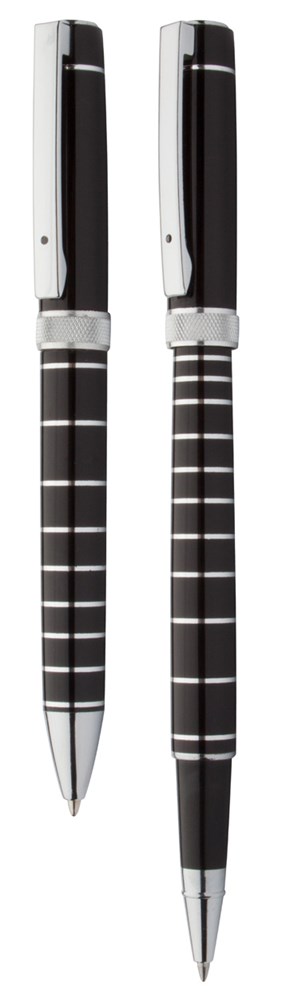 André Philippe. Moderne aluminium pennenset met een balpen en een rollerpen. Met glimmende punt en aluminium decoratie in zwarte geschenkverpakking. Blauw schrijvend.