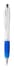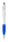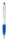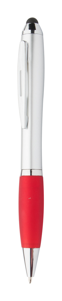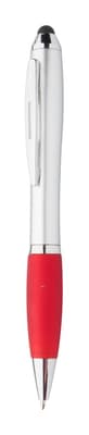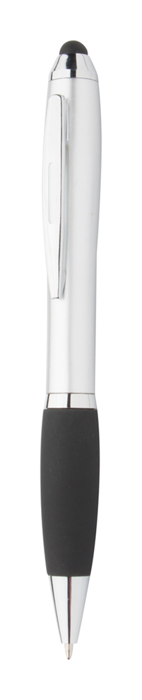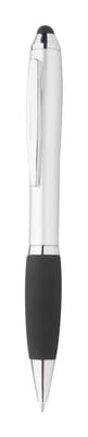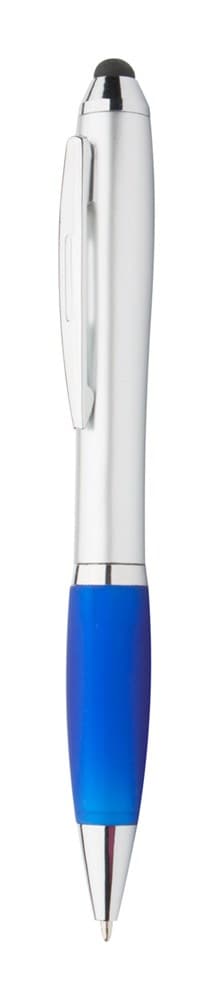Zilveren plastic balpen met touchscreen tip en gekleurde rubberen grip. Blauw schrijvend.