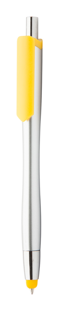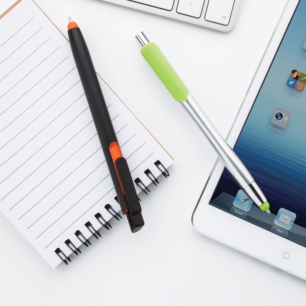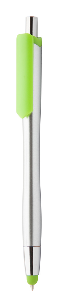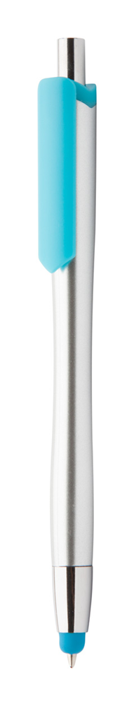 Plastic balpen met gekleurde touchscreen tip en clip, zilverkleurige loop. Blauw schrijvend.