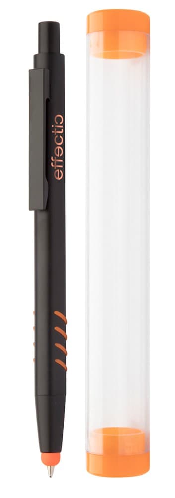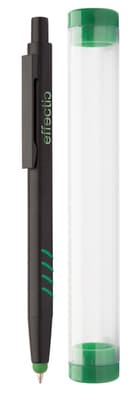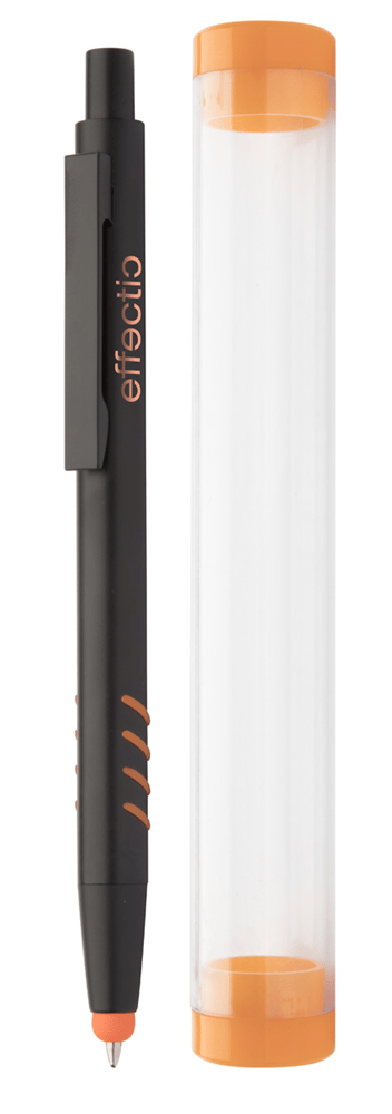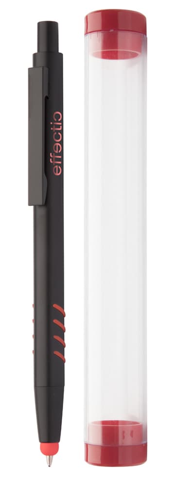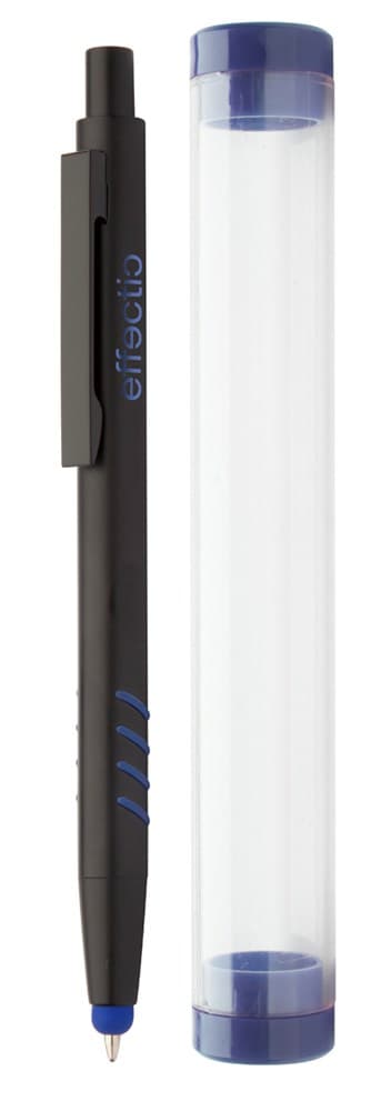Aluminium balpen met touchscreen tip en rubberen grip en tip. Met speciale coating voor gekleurde gravure. In plastic koker met bijpassend gekleurde top. Blauw schrijvend.