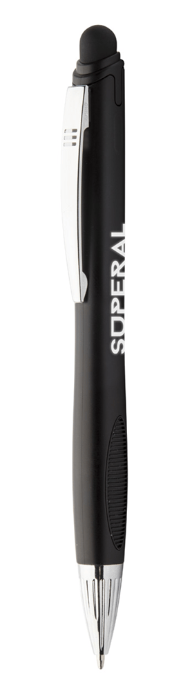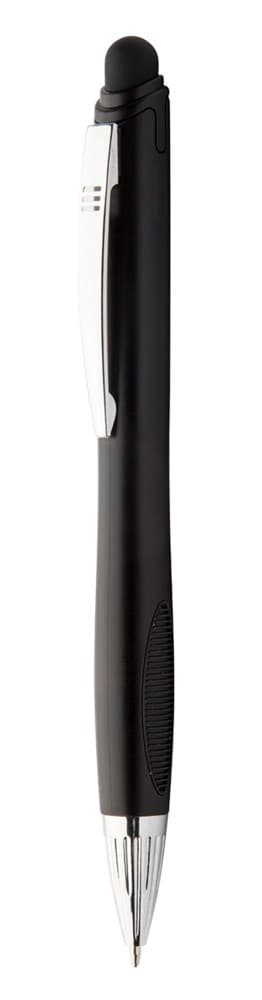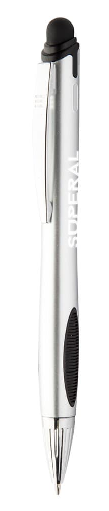 Plastic balpen met stylus en metalen clip. Met 1 ledlampje voor verlichte gravure. Met knopcel batterij. Blauwschrijvend.