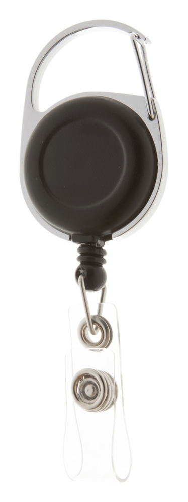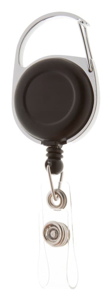 Metalen en plastic pashouder met telescopische koord en karabijnhaak.