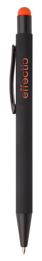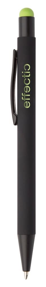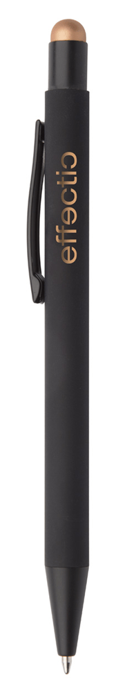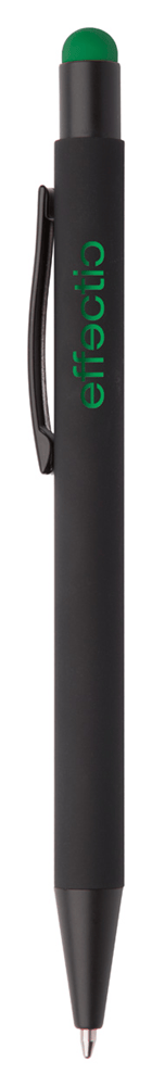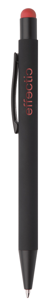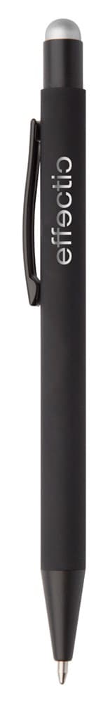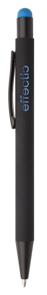 Aluminium balpen en touchscreen tip met rubberen afwerking. Met speciale coating voor spiegelgravure passend bij de kleur van de touchscreen dop. Blauw schrijvend.