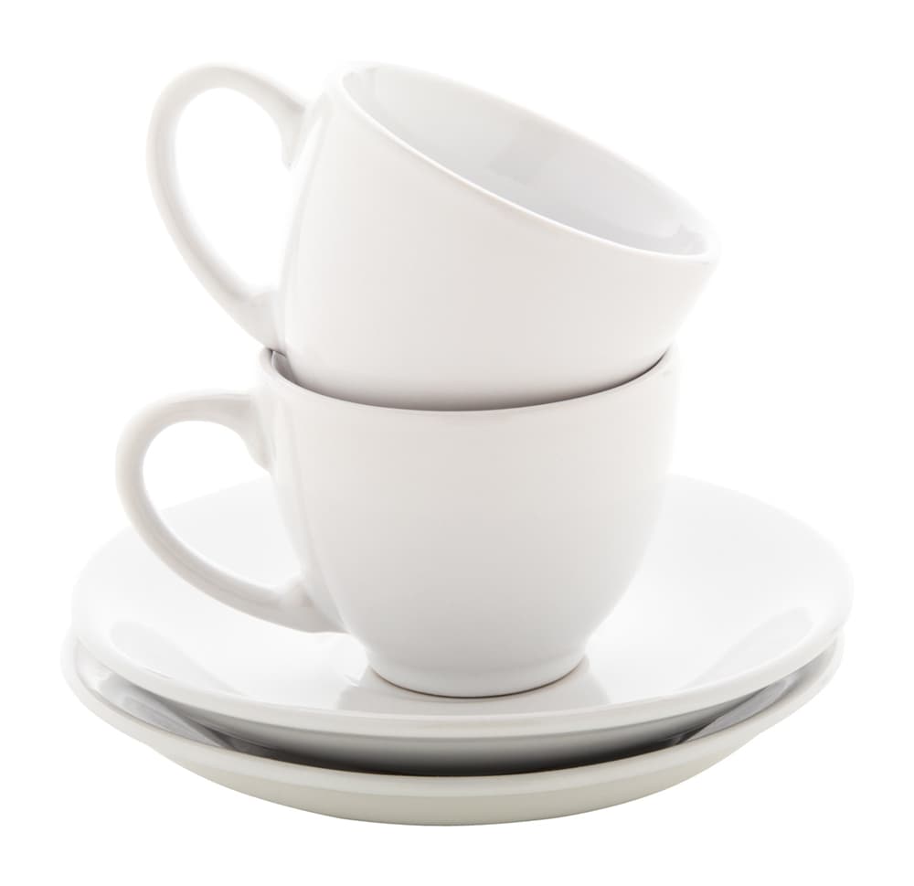 Keramiek espresso set met 2 kopjes (90 ml.) en schoteltjes. In wit papier doos. Ideaal voor espressokopjes bedrukken.