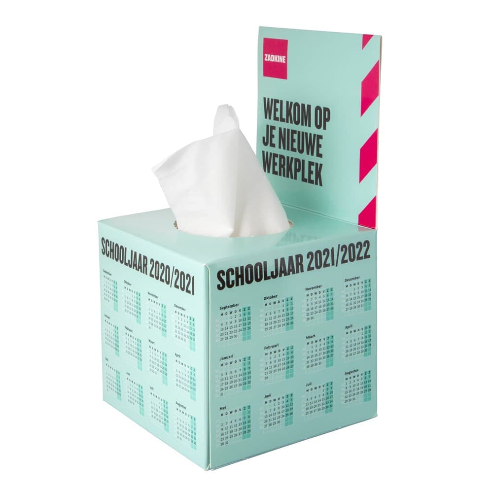 Vierkante tissuebox met flap, gevuld met 50 3-laags tissues. Laat je tissues bedrukken door De Pennenboer.