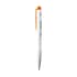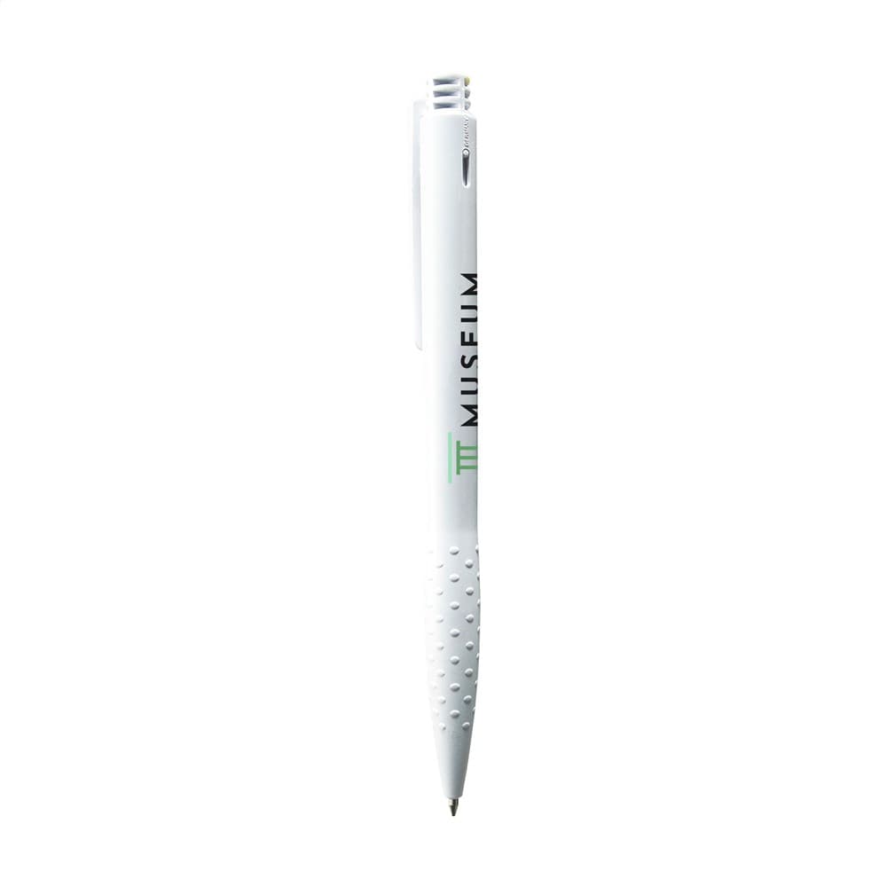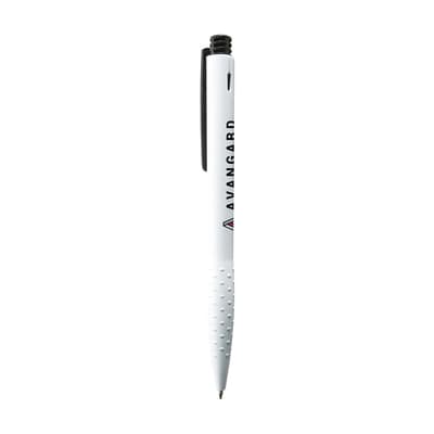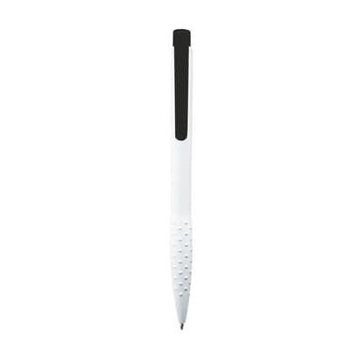 Blauwschrijvende óf zwartschrijvende balpen met gripvast voorstuk, gekleurde clip en drukknop.