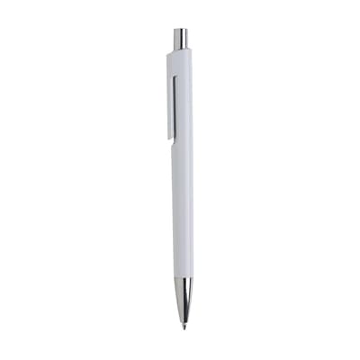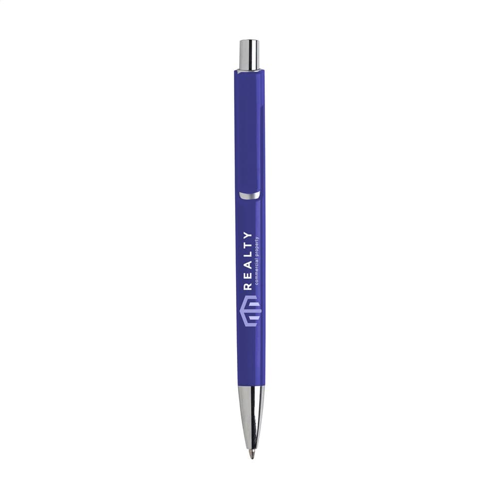 Blauwschrijvende balpen met uniek design: de body en clip van deze balpen zijn uit één geheel vormgegeven en dat maakt deze pen tot een bijzondere eyecatcher. Met opvallend zilverkleurig accent onder de optisch 'zwevende' clip.