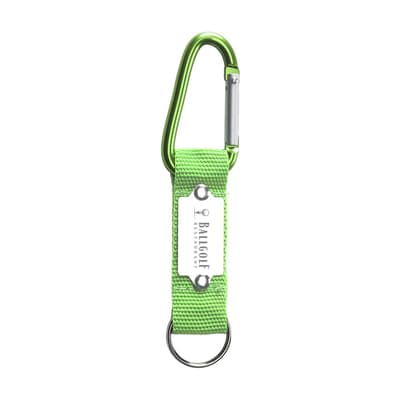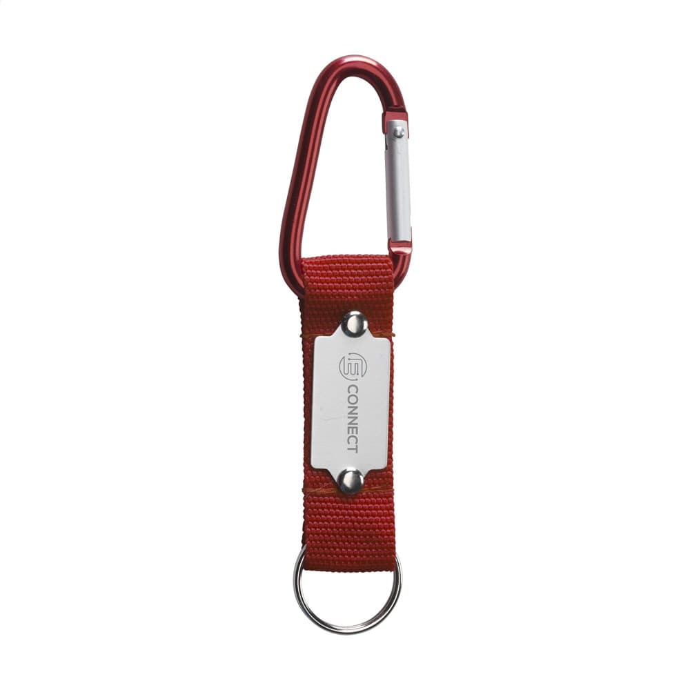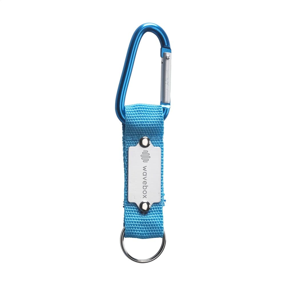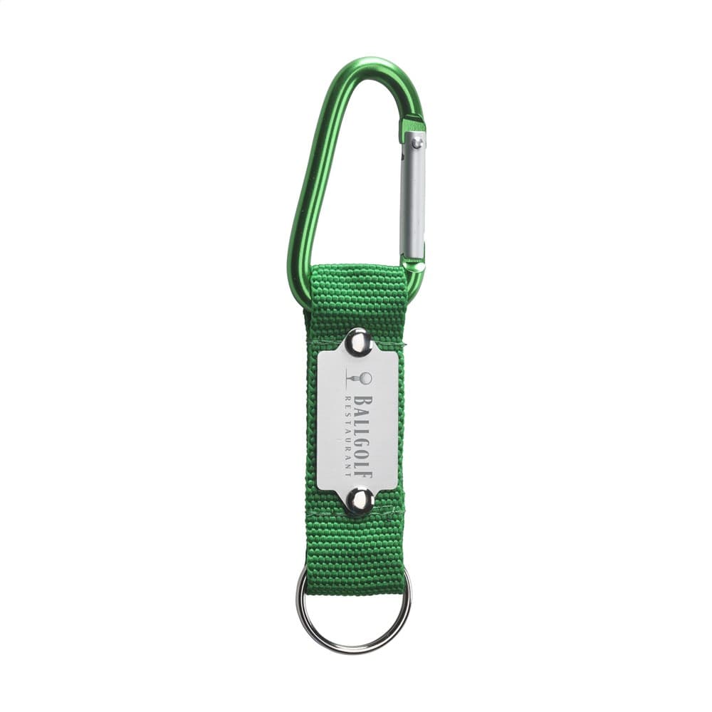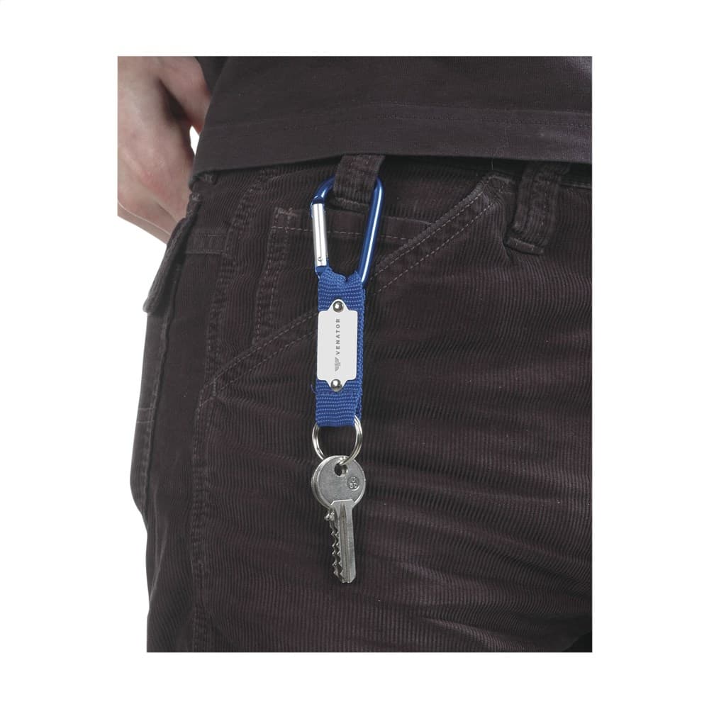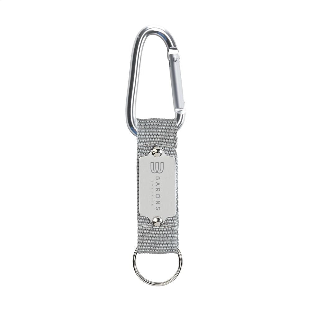 Karabijnhaak gecombineerd met sterk geweven nylon aan stevige sleutelring.