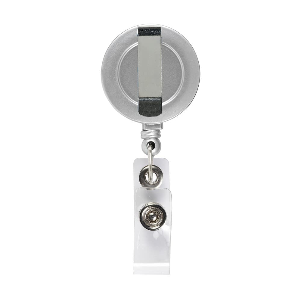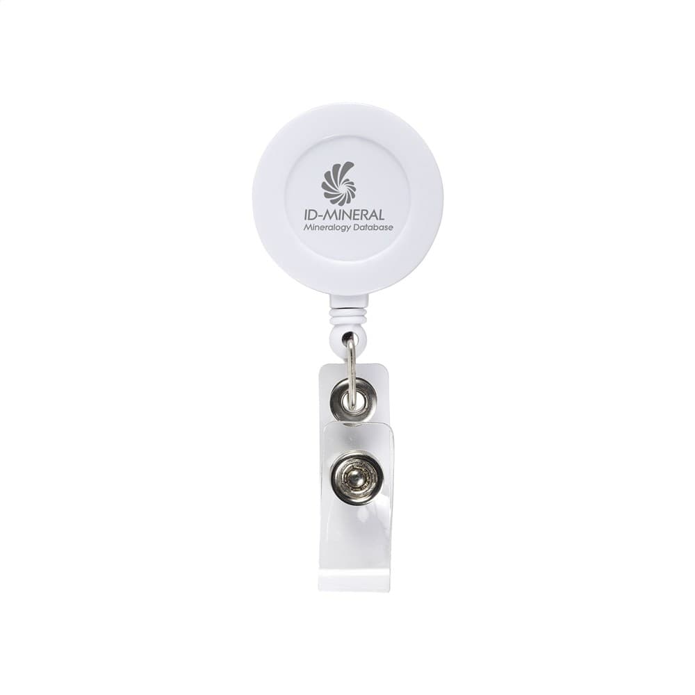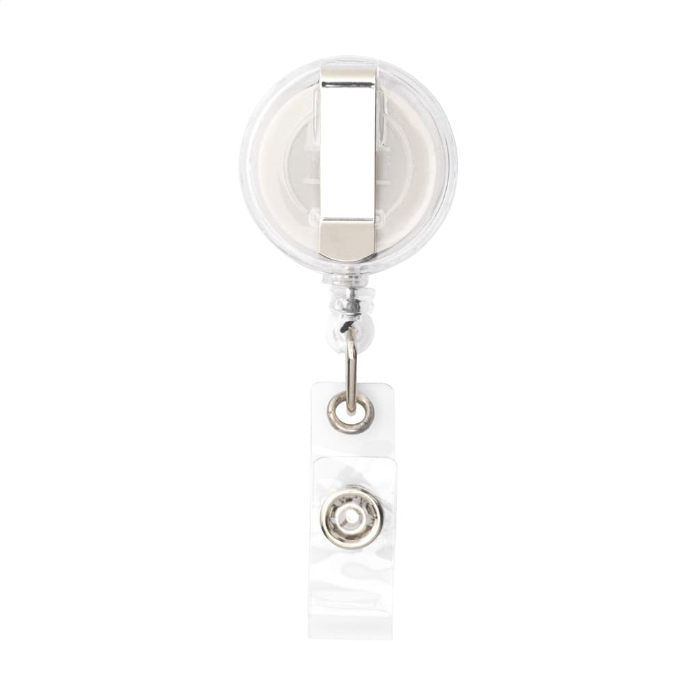 Badgehouder met metalen bevestigingsclip, oprolbaar nylon koord en badgeclip met drukknoop.