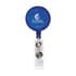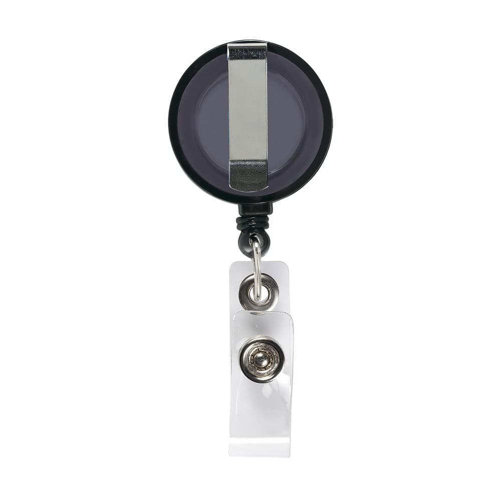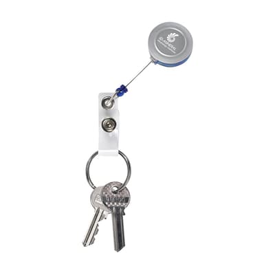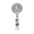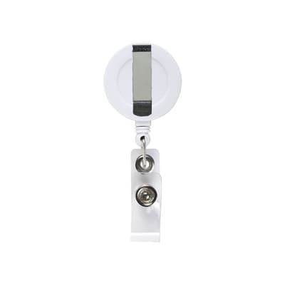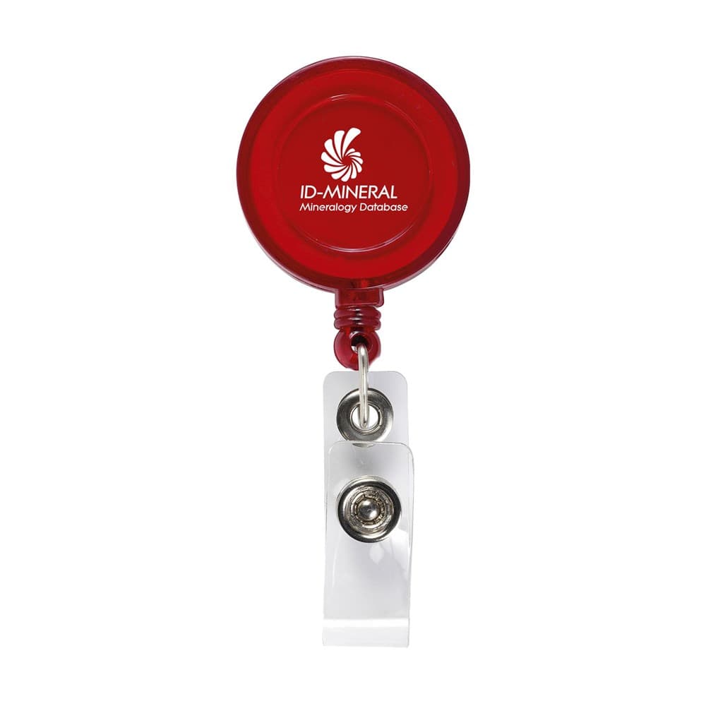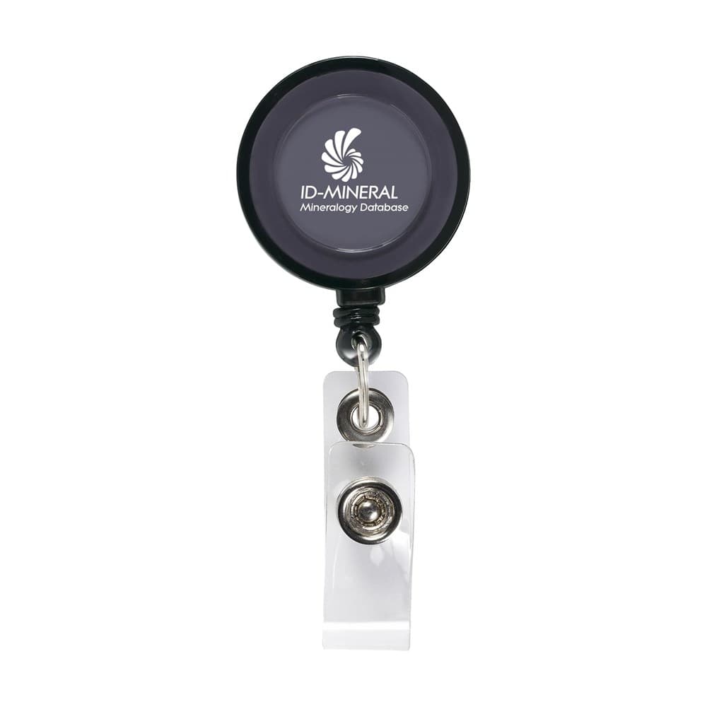 Badgehouder met metalen bevestigingsclip, oprolbaar nylon koord en badgeclip met drukknoop.