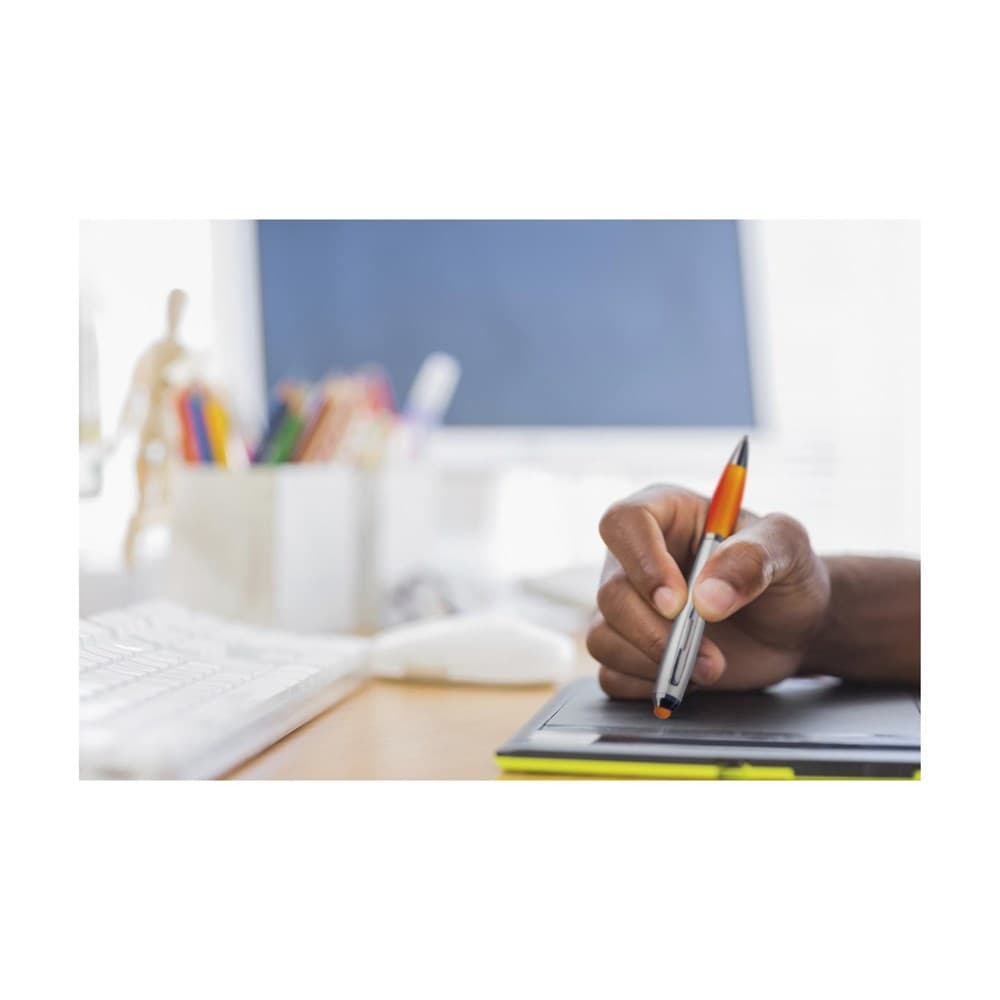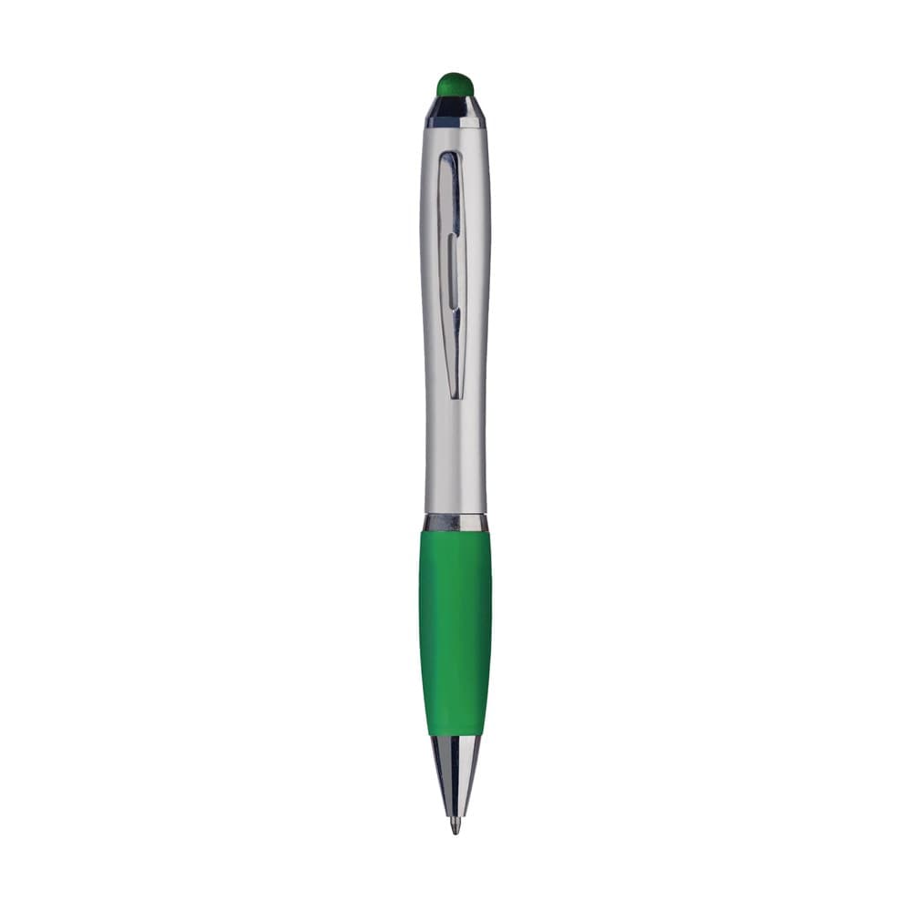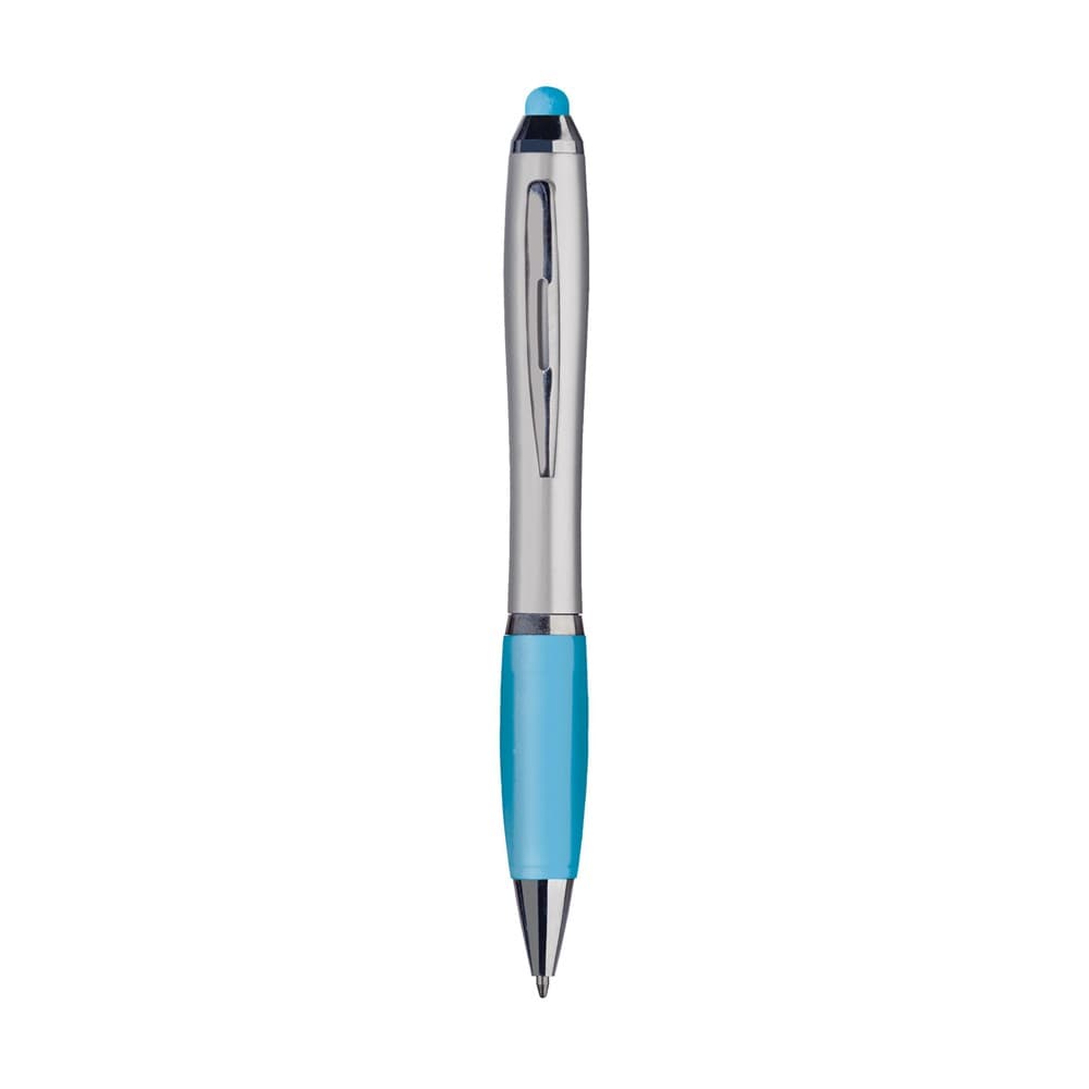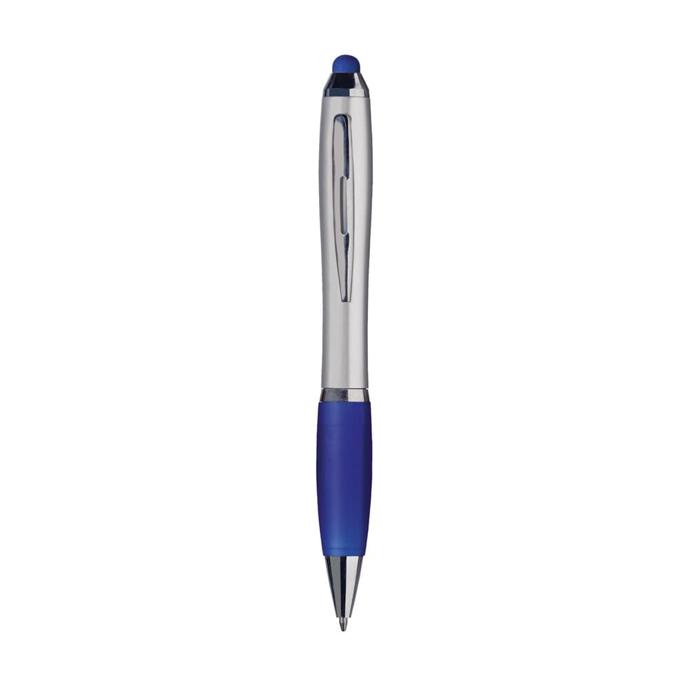 Blauwschrijvende balpen met gekleurde, rubberen top/pointer voor het bedienen van touchscreens (zoals iPhone/iPad). Voorzien van hoogglans accenten, gekleurd, gripvast voorstuk, uitsparing in metalen clip en draaikliksysteem.
