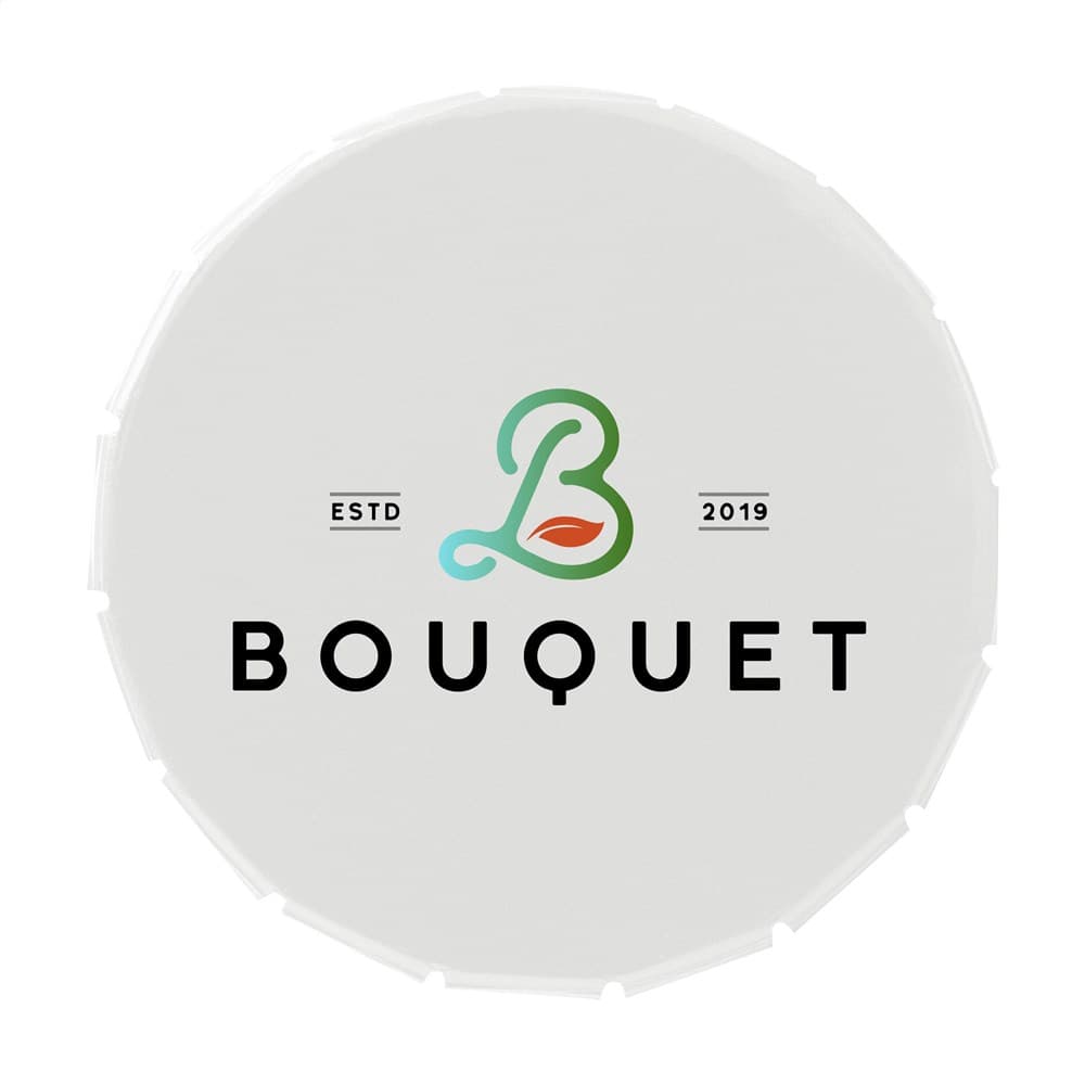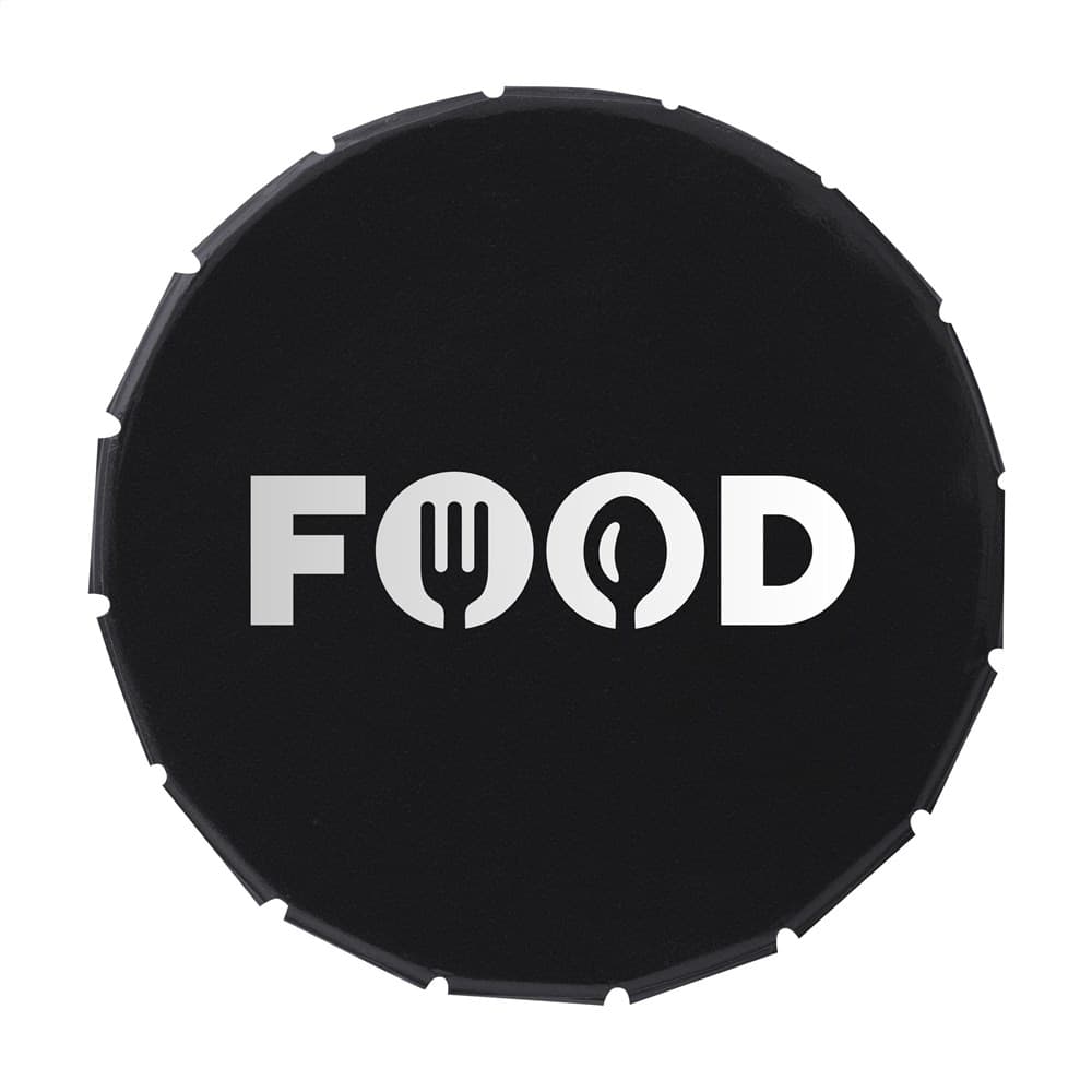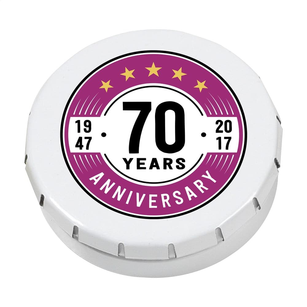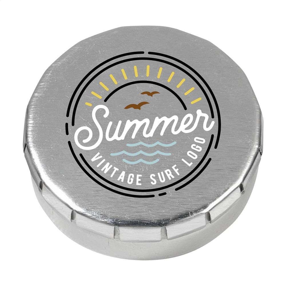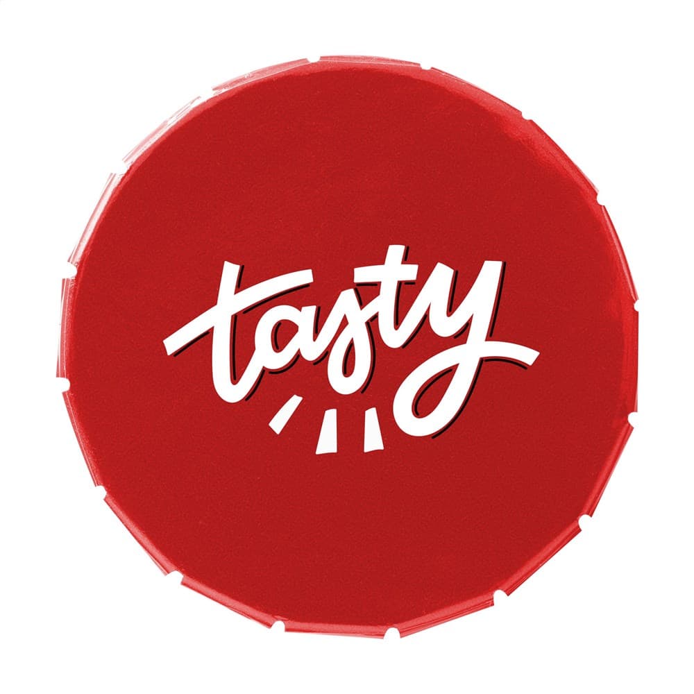 Uitdeelblikje met handig druk-/kliksysteem. Gevuld met ca. 12 g snoepjes.