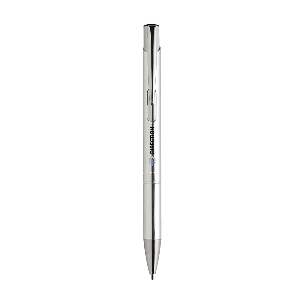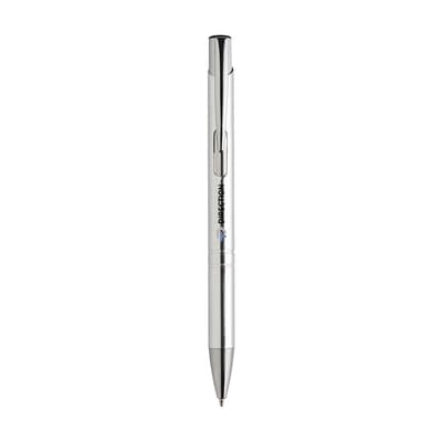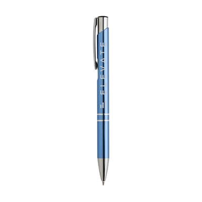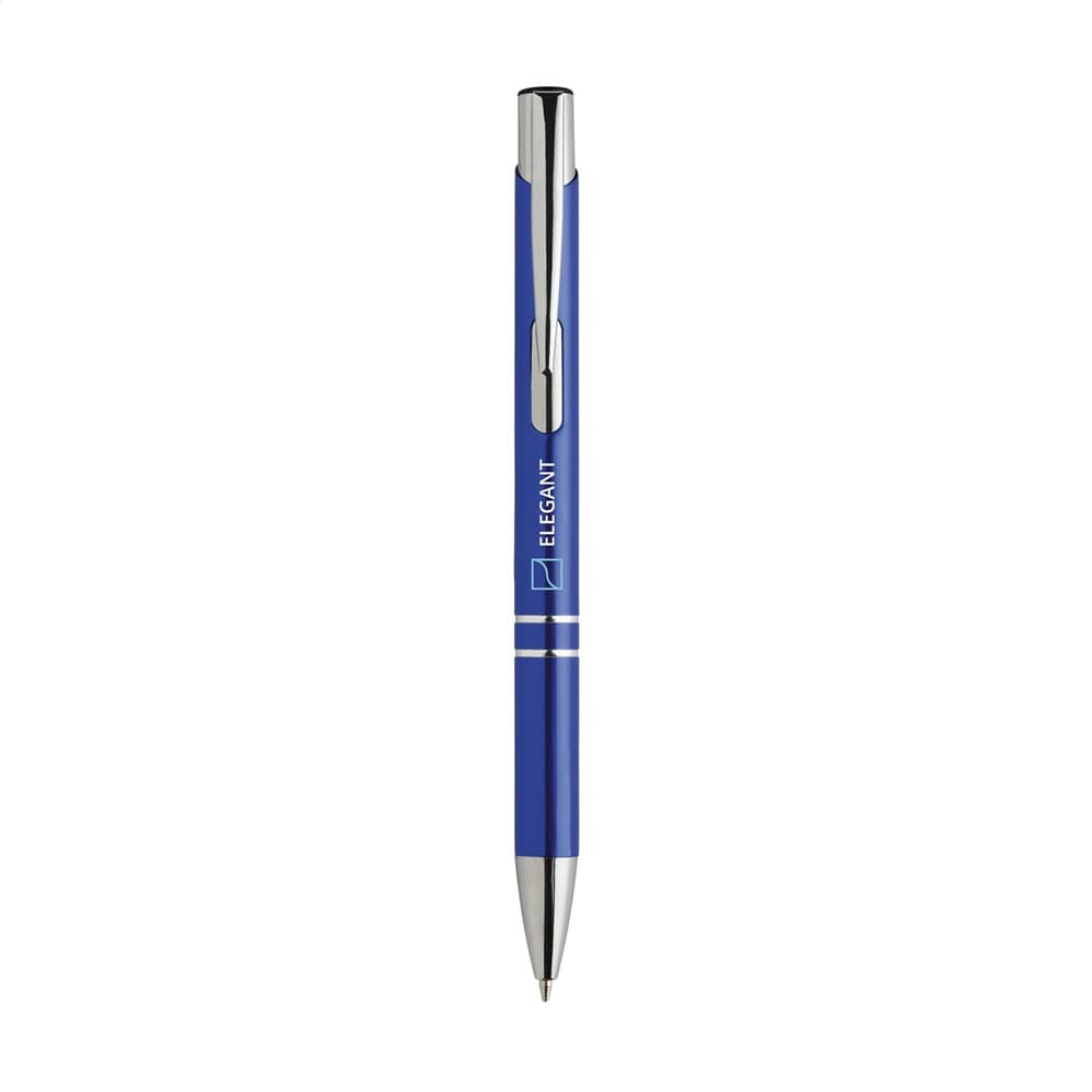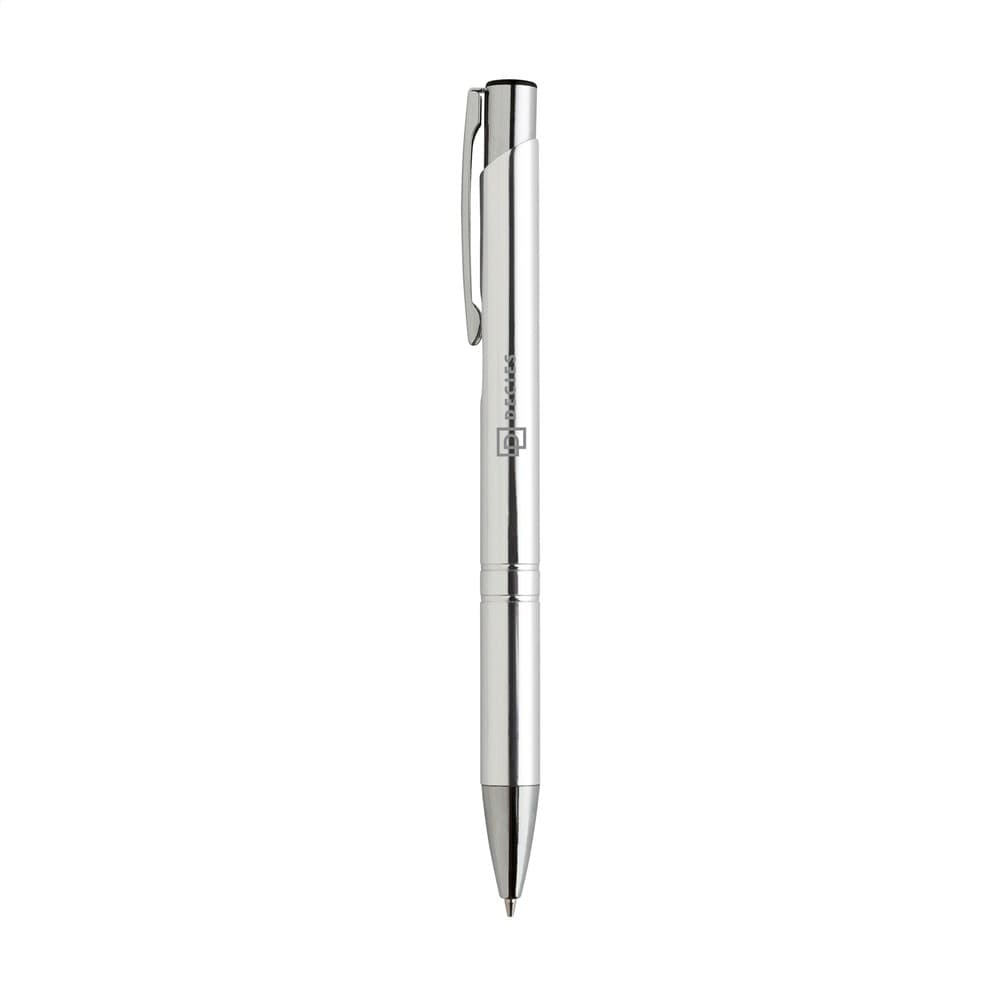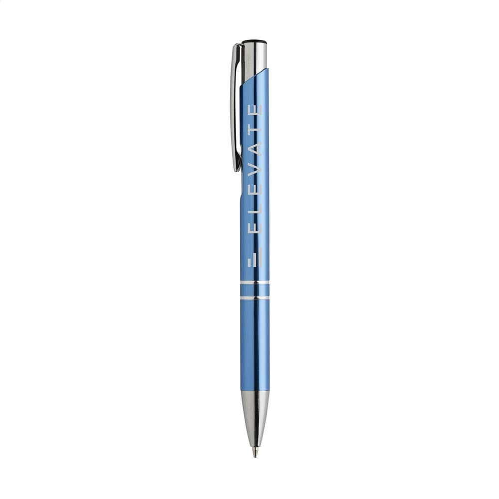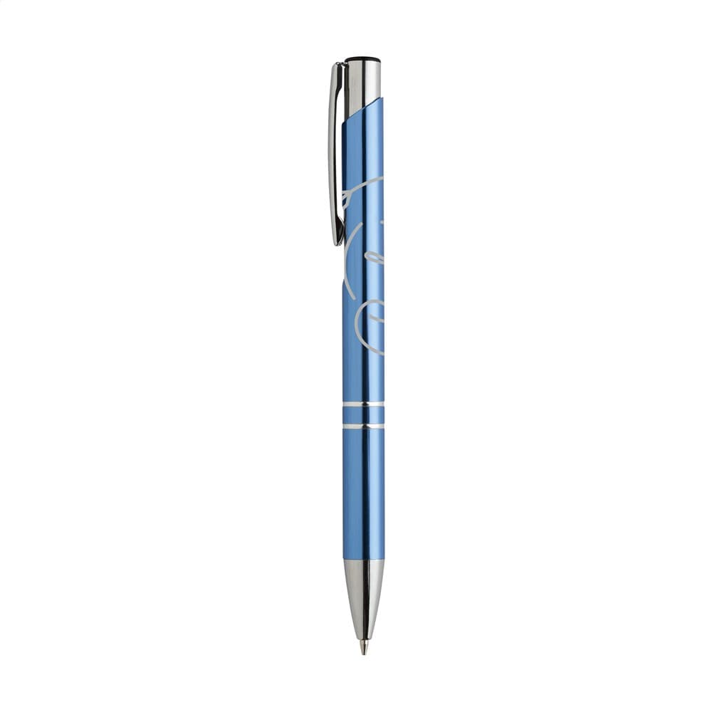 Blauwschrijvende, aluminium balpen met glanzende, metallic look houder en metalen clip.