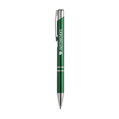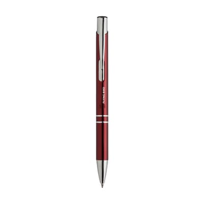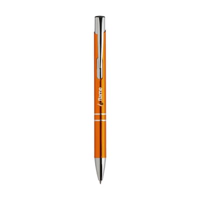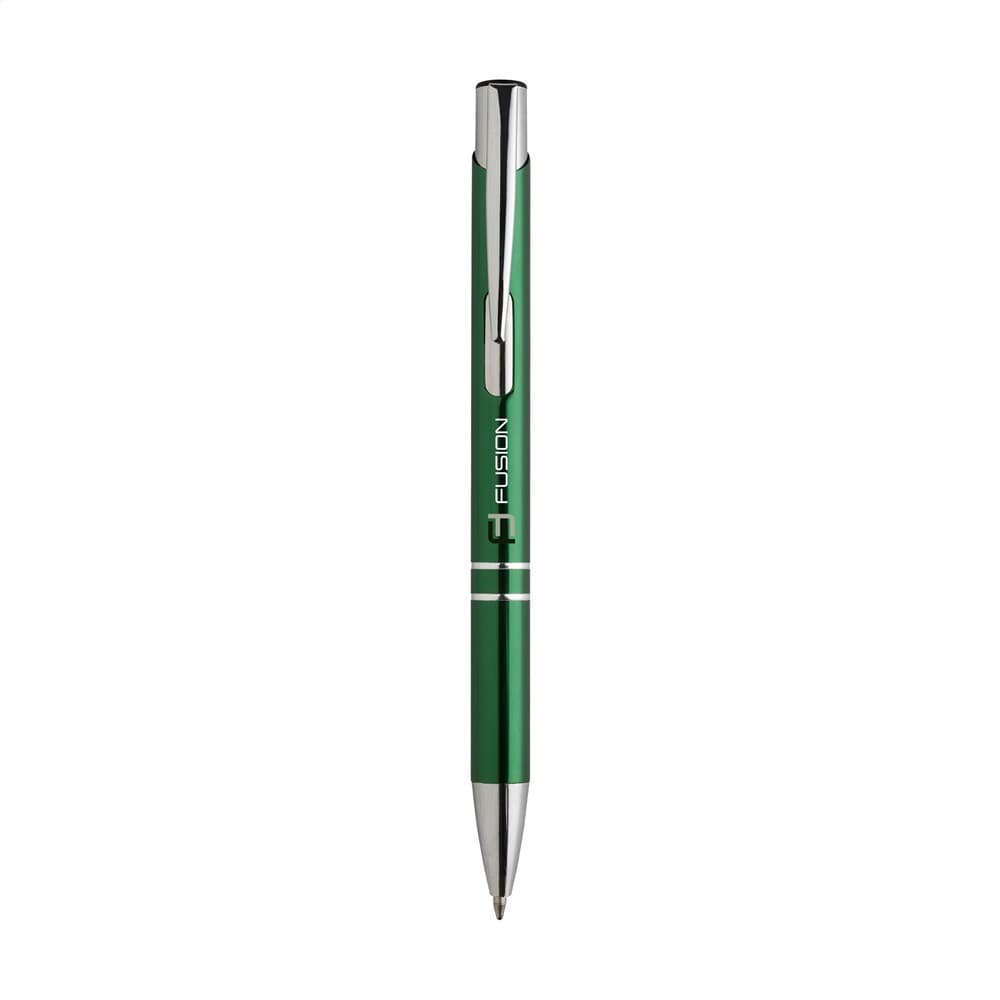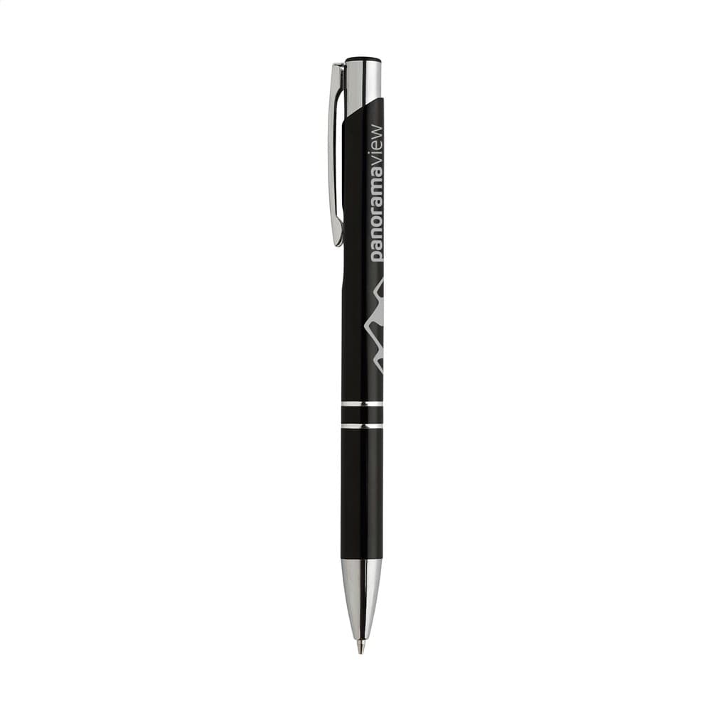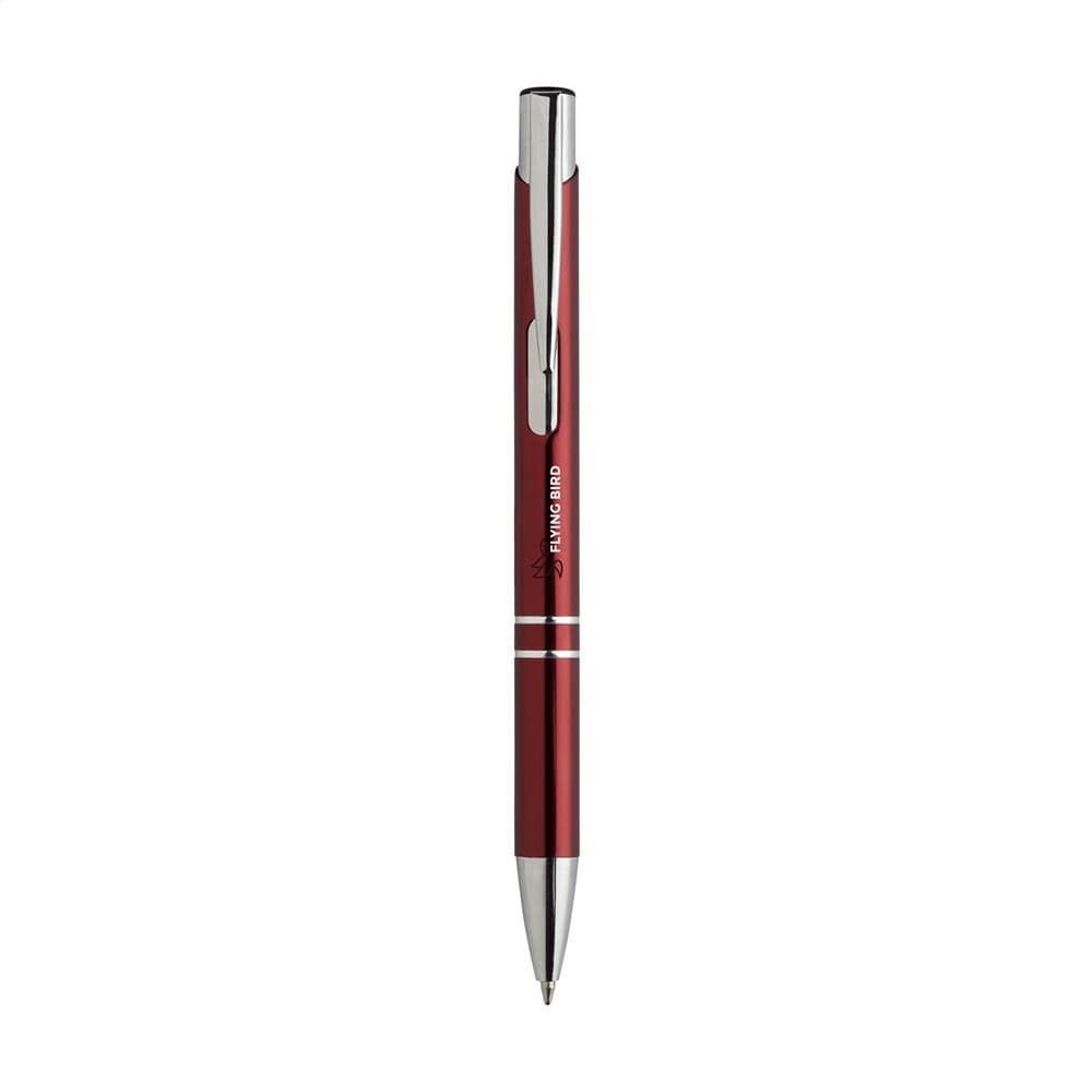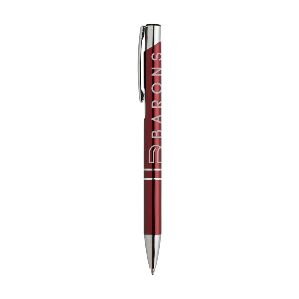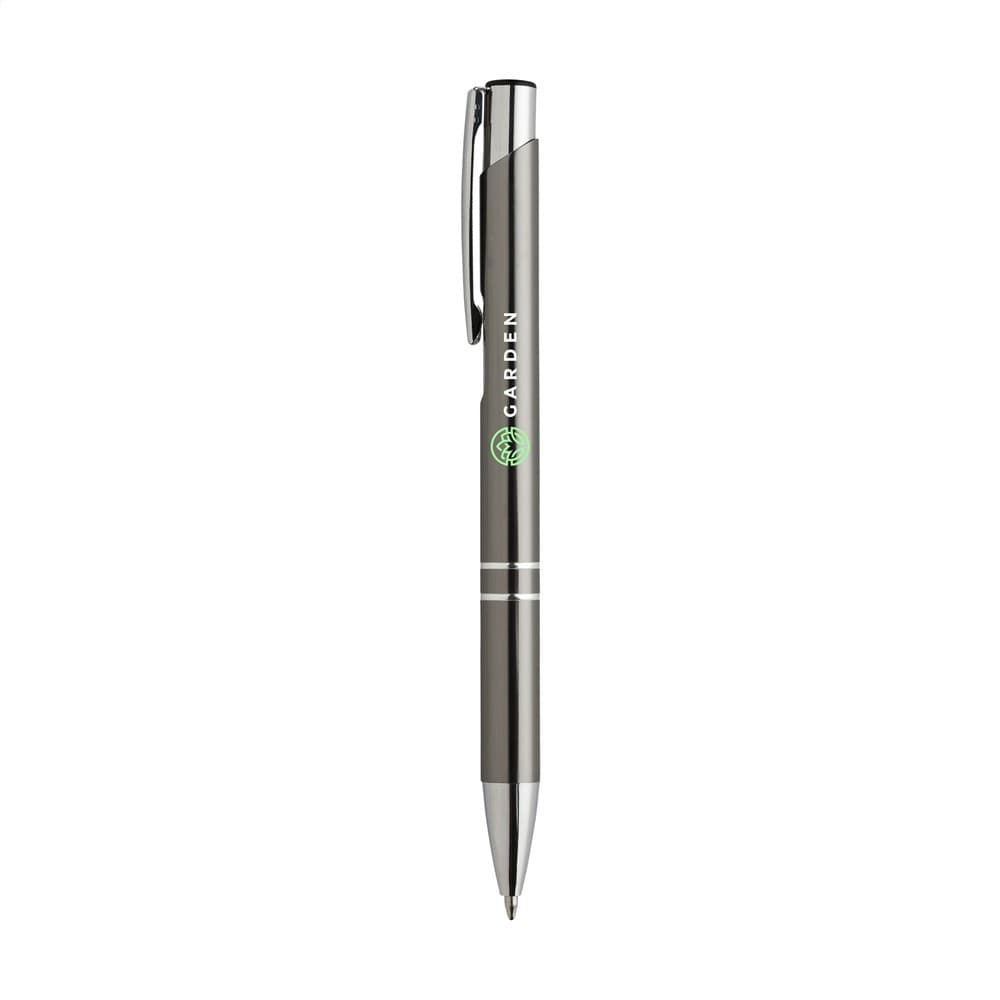 Blauwschrijvende, aluminium balpen met glanzende, metallic look houder en metalen clip.