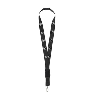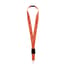 Lanyard van sterk geweven polyester met metalen karabijnhaak en veiligheidssluiting. Het onderste gedeelte is los te koppelen d.m.v. een kunststof kliksysteem.