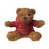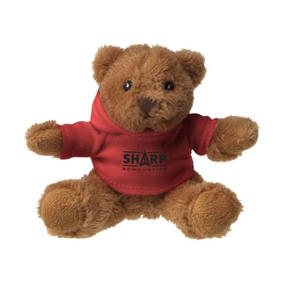 Kleine, pluche beer met hooded shirt. Het blauwe (30) en rode (60) shirt kunnen alleen met zwart bedrukt worden. Zonder opdruk worden de beren en shirts los geleverd.