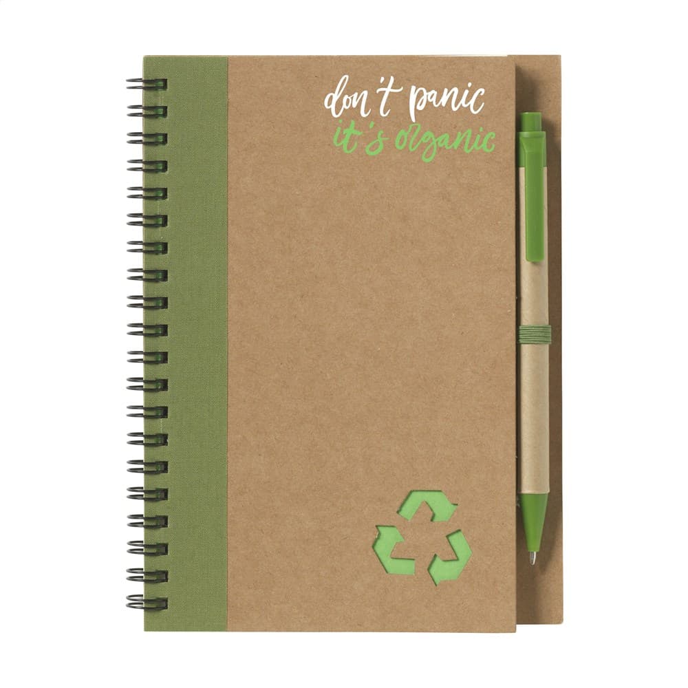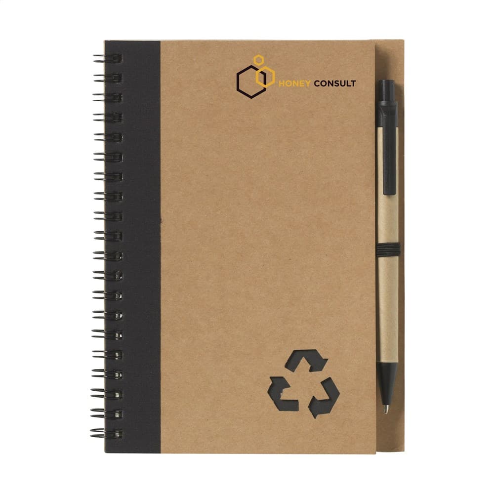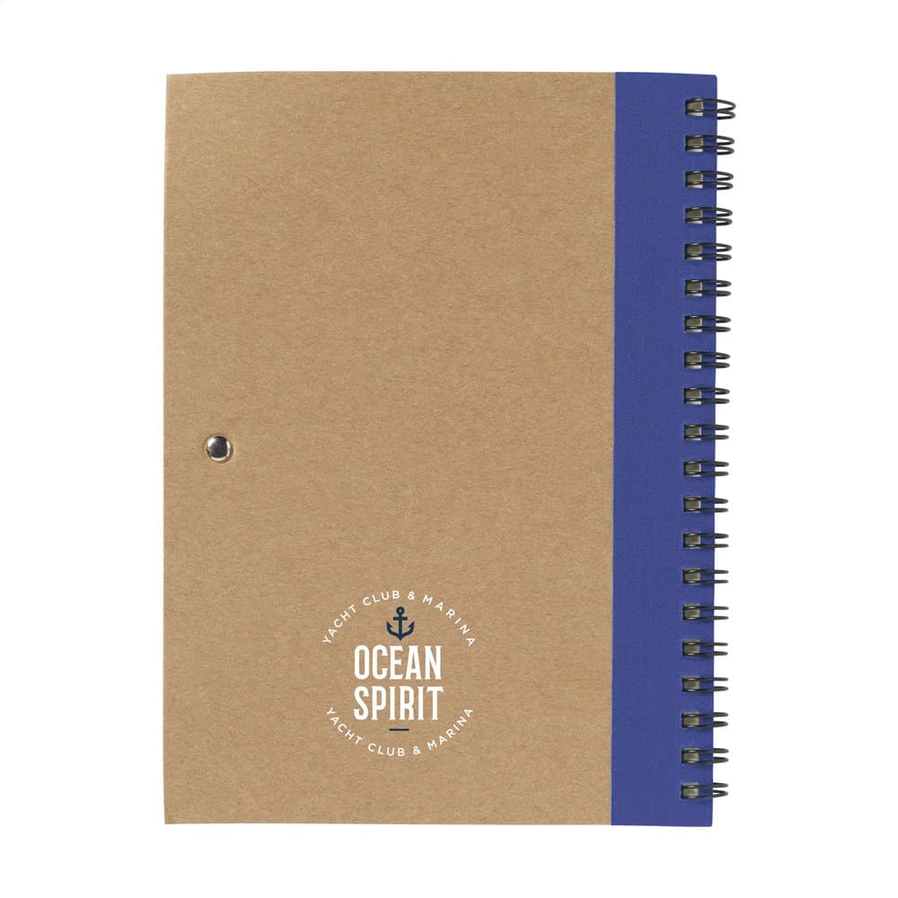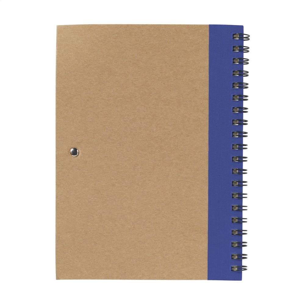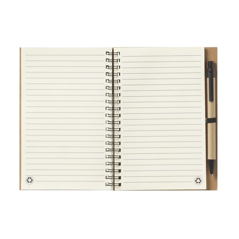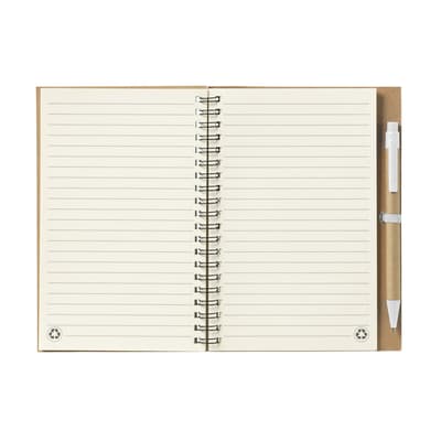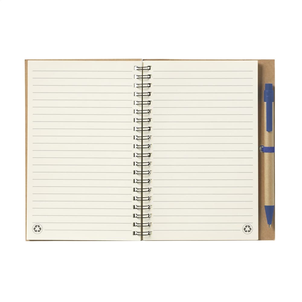 Milieuvriendelijk notitieboekje van gerecycled materiaal met ca. 70 vel/140 pagina's crèmekleurig, gelinieerd papier (70 g/m²), kartonnen omslag. Gebonden in een sterke, metalen wire-o-binding. Incl. blauwschrijvende balpen.