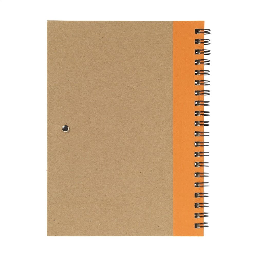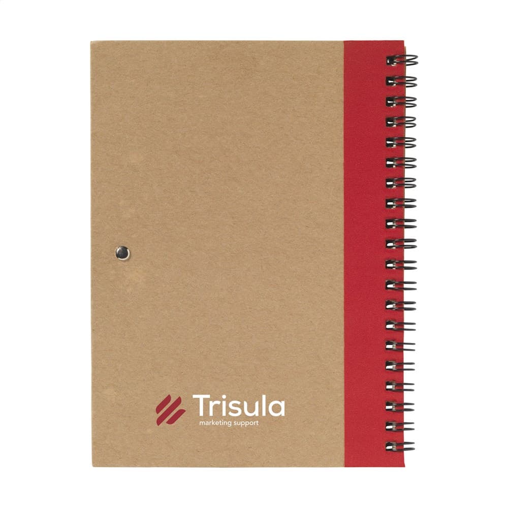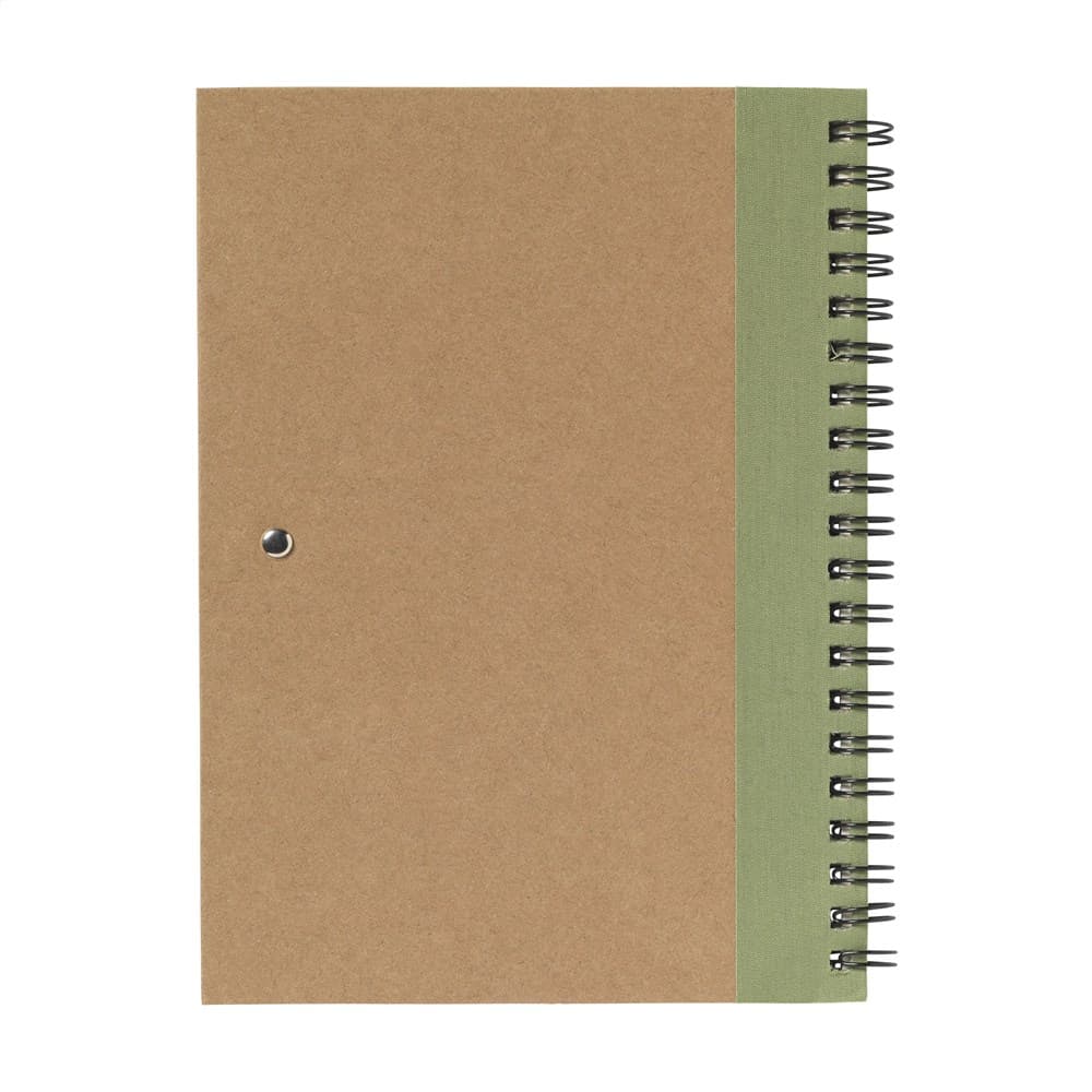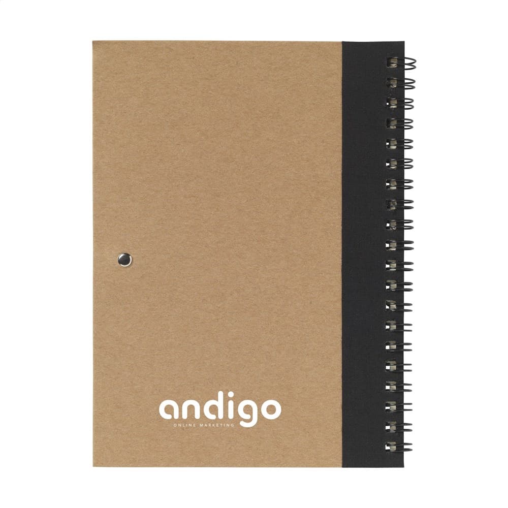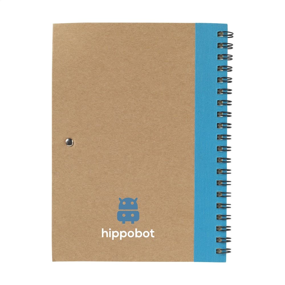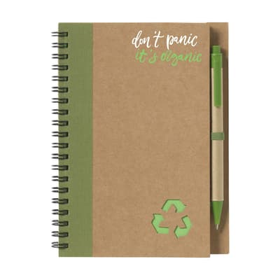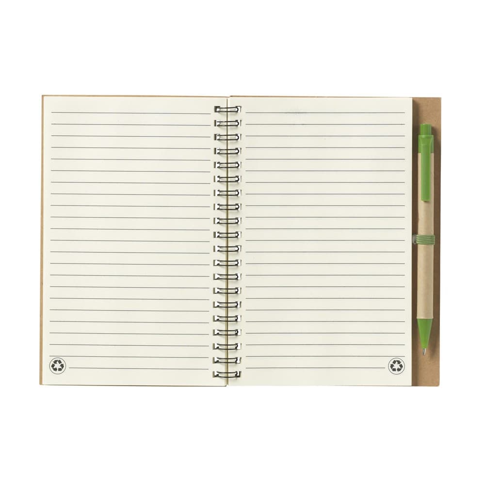 Milieuvriendelijk notitieboekje van gerecycled materiaal met ca. 70 vel/140 pagina's crèmekleurig, gelinieerd papier (70 g/m²), kartonnen omslag. Gebonden in een sterke, metalen wire-o-binding. Incl. blauwschrijvende balpen.