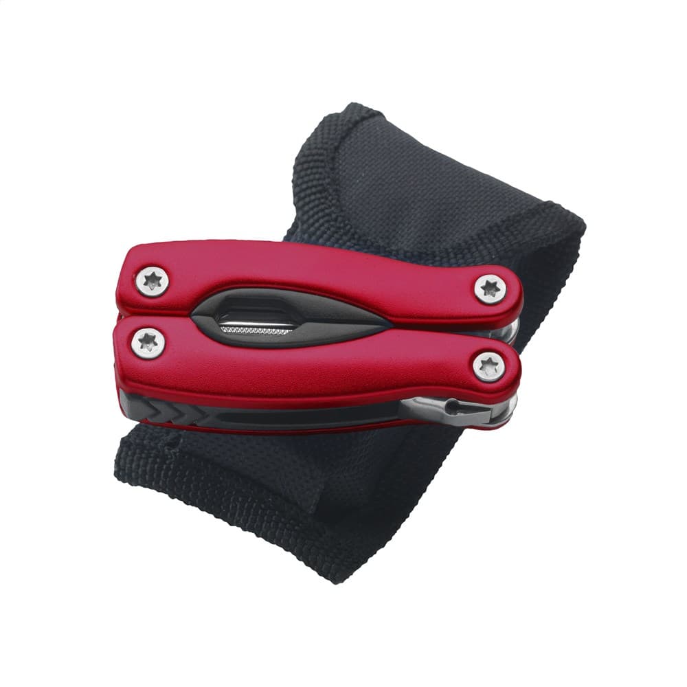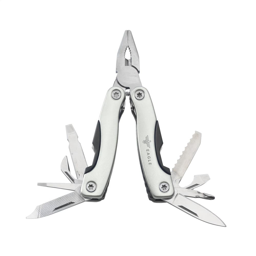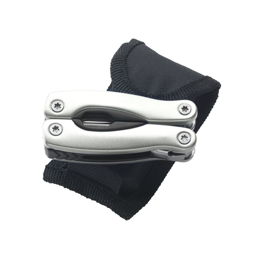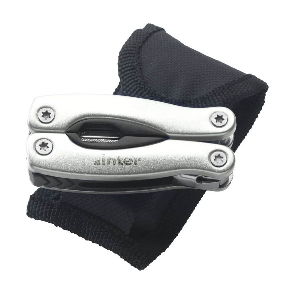 Compacte RVS multitang met aluminium handgreep in metallic look. 9-delig met 13 functies: tang, draadknipper, 3 schroevendraaiers, priem, vijl, blikopener, flesopener, visschraper, visonthaker, mes, philips kruiskopschroevendraaier. Met vergrendeling. In nylon etui. Op het bezit en/of dragen van messen of multitools in het openbaar kunnen lokale regels van toepassing zijn. Per stuk in doosje.